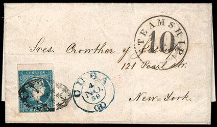 Spanish Cuba, 1855, Queen Isabella II, ½r blue green on blue paper. Four margin single with sheet margin at top, tied on 1859 folded letter from Santiago de Cuba to New York by fancy oval grid, blue "Cuba 4 No, 59 " cds alongside and "Steamship 10" handstamp at right, the ½ real paying the letter rate for outbound ship mail, Extremely Fine and attractive. Scott No. 1; Estimate $500 - 750. US$500-750 (Image)