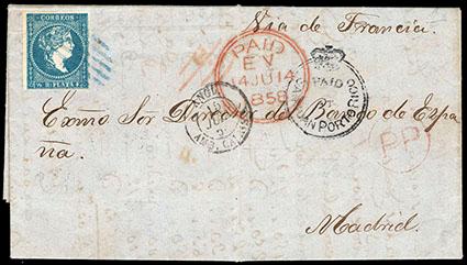 Spanish Puerto Rico; Cuba, 1855, Queen Isabella II, ½r blue-green. Lovely four margin single, tied to 1858 folded letter from San Juan, Puerto Rico to Madrid, Spain with blue oval grid cancel, endorsed "Via de Francia" at upper right, "Paid at, San Juan Porto Rico" crown circle handstamp, Calais transit, red London "Paid" and "PP" in circle all on front, backstamped with "San Juan Porto Rico, My 29, 1858" cds, Paris transit and "Madrid, 13 Jun, 58" receiving datestamps, an Extremely Fine usage, with 2012 Comex certificate. Scott No. A1; Estimate $1,500 - 2,000.
