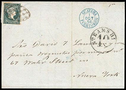 Spanish Puerto Rico; Cuba, 1855, Queen Isabella II, ½r blue green. Four margin single, tied to 1856 folded letter from Guayama, Puerto Rico to New York with fancy oval handstamp, "Guayama, Puerto Rico, 1 Oct, 56" double ring cds in blue and "Steamship 10" handstamp, at right, backstamped with blue Havana transit marking, Very Fine and choice, very scarce, Illustrated in Wierenga (fig. 382). ex-Frajola. Scott No. A1; Estimate $1,000 - 1,500.