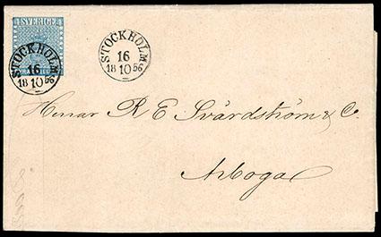 Sweden, 1855, 4sk light blue. Tied to 1856 folded letter from Stockholm to Arboga with "Stockholm 16, 10, 1856" cds, a second strike at right, Extremely Fine, scarce in such nice condition. Michel No. 2a. Facit No. 2. Scott No. 2; Estimate $100 - 150. US$100-150 (Image)