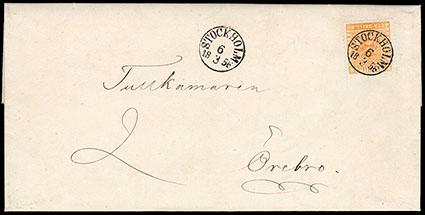 Sweden, 1855, 8sk orange. Well centered single tied to folded letter to Orebro with "Stockholm 6, 3, 1856" origin cds, a second strike at right, Superb, scarce and extremely fresh first issue cover. Michel No. 4. Facit No. 4. Scott No. 4; Estimate $500 - 750. US$500-750 (Image)