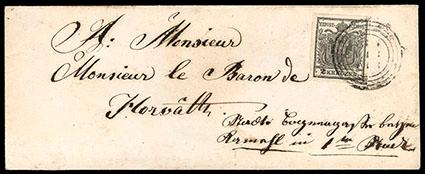 Austria, 1850, Coat of Arms, 2kr black, hand-made paper. Four large even margins, tied on cover mailed locally in Vienna with rare "mute" cancel (Muller 3214g, 240P), backstamped "Wien 14 Dec" cds, Extremely Fine, a very rare cancel on cover, with 2007 Puschmann Certificate. Michel No. 2 X a. Scott No. 2; Estimate $200 - 300. US$200-300 (Image)