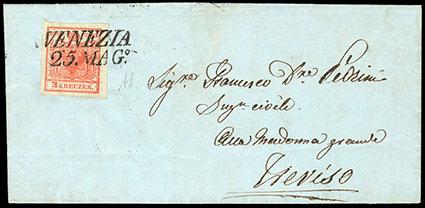 Austria, 1850, Coat of Arms, 3kr red, hand-made paper. Tied on folded letter to Treviso, with "Venezia 25, Mago" italic double straight line datestamp, receiving backstamp, Extremely Fine, very scarce. Michel No. 3 X a. Scott No. 3; Estimate $300 - 400.
