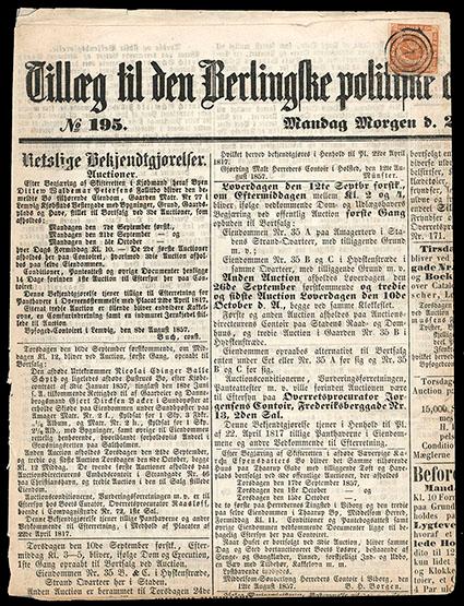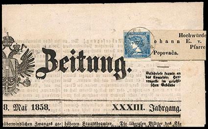 Austria, Newspaper Stamp, 1851, Mercury (0.6kr) blue, type IIa. With four margins tied on portion of 1858 newspaper front page with address label, locally used in Popovaca (Croatia) with "Popovaca 9-5" cds, Very Fine, a scarce Croatian usage. Michel No. 6 II. Scott No. P1; Estimate $150 - 200. US$150-200 (Image)