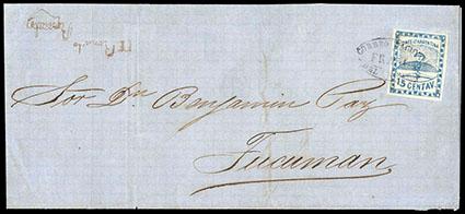 Argentina, 1858, Confederation, 15c blue. Four large even margins, tied to 1858 folded letter sheet from Rosario to Tucuman with oval "Correos Nacional Franca Del Rosario" handstamp; cover with top flap mostly missing, Very Fine, scarce, ex-Provera, with Alberto E. Solari certificate. Scott No. 3; Estimate $750 - 1,000.
