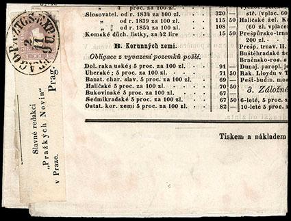 Austria, Newspaper Stamp, 1859, Franz Joseph (1kr) lilac, type II. With four large margins tied on complete 1859 newspaper used locally in Prague with oval "PRAG.O.P.A.ZTGS EXP 2-11" oval datestamp along with address label, Extremely Fine, scarce complete newspaper. Michel No. 17 b. Scott No. P6; Estimate $300 - 400. US$300-400 (Image)