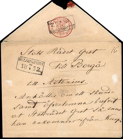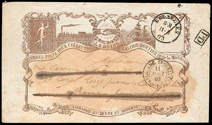 Belgium, J.B. Moens, Timbre-Poste Pour Collection Gallerie Bortier (r. de la Madeleine).allover brown advertising with floral bordered address panel and showing Mercury and Forms of Transportation on 1863 cover from Brussels to Rome then forwarded, with "Bruxelle, 11-8 63" cds, boxed "PD" handstamp and "Belg, Amb Erquelline" railroad marking on front, address partially deleted and re-addressed, backstamped Rome receiving mark, final destination marking unclear, with additional ad text on reverse, some unimportant staining address panel, Extremely Fine. Estimate; $750 - 1,000.