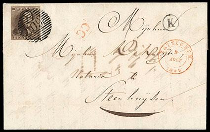 Belgium, 1849, 10c brown. Four large even margins, tied by with bold barred numeral "109" on 1849 folded letter from Sotteghem to Steenhuysen with small K in circle indicating Rural origin, postmarked red "Sotteghem 3 Auot, 1849" double circle at right and backstamped with a second strike date "4 Aout", Extremely Fine and choice. Michel No. 1a. Scott No. 1; Estimate $500 - 750. US$500-750 (Image)
