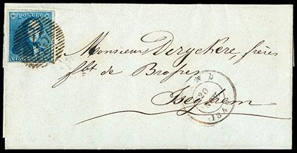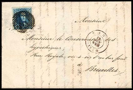 Belgium, 1850, 20c blue. Pos. 1. Corner margin single with four large to huge margins, tied on 1850 folded letter from Gand to Brussels with numeral "4" in circular grid, red "Gand 13 Nov, 1850" cds at right, backstamped with blue " Brussels 20 Nov, 1850 " cds, Very Fine,ex-Karpov. Michel No. 4A. Scott No. 4; Estimate $100 - 150. US$100-150 (Image)