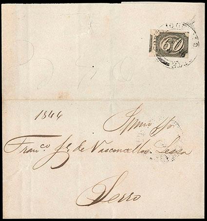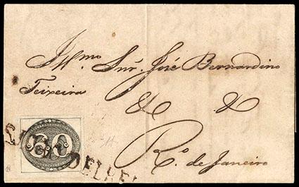 Brazil, 1844, Second Issue ("Cat's Eye"), 60r black. Rich color, fine impression part of adjoining stamp at left and margins just touching at bottom, tied on reverse of 1866 folded lettersheet by "Correio Geraldacorte, Rio de Janeiro" cds to Serro, Very Fine, with 2010 Moorhouse certificate. Scott No. 9; Estimate $500 - 750. US$500-750 (Image)