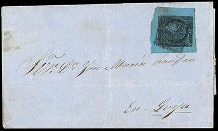Corrientes, 1855 Ceres, black on blue paper, imperf. Type 5. Four large to huge margins, tied to folded letter sheet from Monte Caseros to Gova with square bar handstamp, Very Fine to Extremely Fine, rare with handstamp cancel. Scott No. 1; Estimate $200 - 300. US$200-300 (Image)