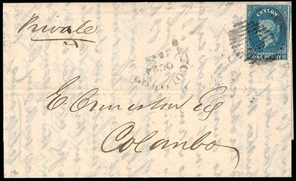 Ceylon, 1857, Queen Victoria, 1d deep turquoise blue, imperf. Large Star watermark. Four margins with part of another stamp at right, tied to 1858 folded letter by grid cancel from Kandy to Colombo with indistinct marking on reverse and "Colombo, Oct 24, 1858" receiving mark on front, Extremely Fine, a wonderful cover in exhibition quality. SG No. 2. Scott No. 3; Estimate $500 - 750. US$500-750 (Image)