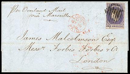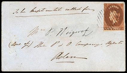 Ceylon, 1857, Queen Victoria, 5d chestnut, imperf. Large Star watermark. Rich color and four even margins, tied to small envelope by light grid cancel, from Galle to Aden, backstamped "Galle Steamer Letter, De 17, 1859" and "Steamer Point" cds's (Aden) both in red, the five pence payed the ½ oz letter rate to Asian ports, Extremely Fine. SG No. 5. Scott No. 6; Estimate $500 - 750. US$500-750 (Image)
