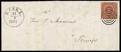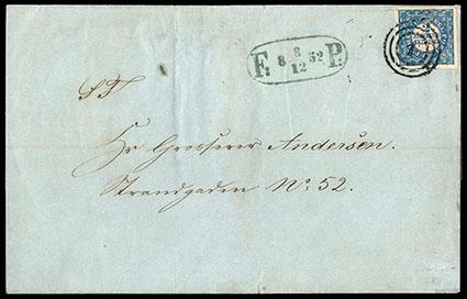Norway, 1855, 4sk blue. Four large even margins, tied to 1856 folded letter from Trondheim to Steinkjer with "Trondheim, 29 2, 1856" cds, paying the domestic letter rate from Jan 1, 1855, Extremely Fine, a very clean and desirable cover, ex-G. Fryer. Michel No. 1. Facit No. 1. Scott No. 1; Estimate $200 - 300. US$200-300 (Image)