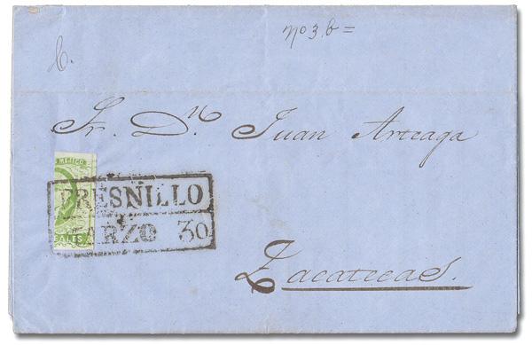 1856, First Issue, 2r yellow green, bisect (Scott 3c), vertical half tied by a clear FRESNILLO boxed cancel, Mar 30, 1858 on a clean folded letter to Zacatecas, Very Fine, with a 1979 M.E.P.S.I. certificate. Scott $600. (Image)
