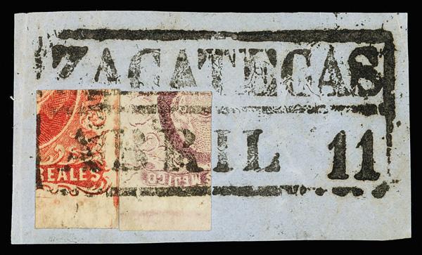 1856, First Issue, 4r red & 8d red lilac, quadrisects used together (Scott 4b, 5d), used as 3r and neatly tied on a small piece by a clear framed "ZACATECAS/ ABRIL 11" cancel (Schatzkès 1851), Very Fine and most unusual, with a 1976 M.E.P.S.I. certificate. (Image)