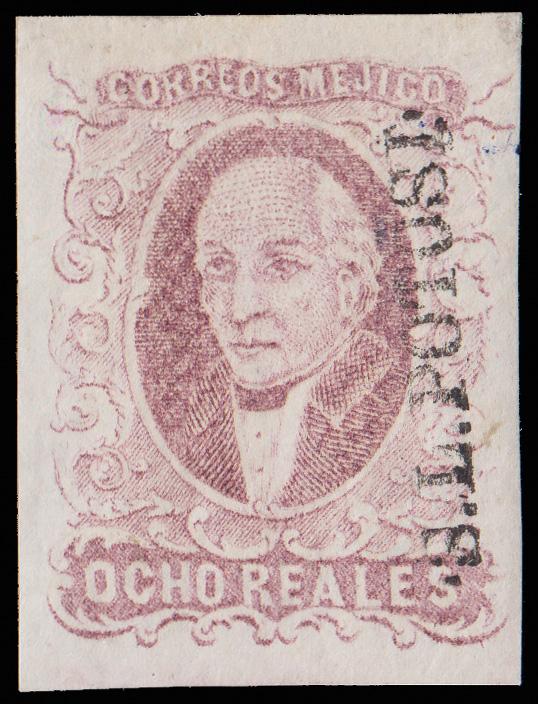 1856, First Issue, 8r red lilac, double overprint (Scott 5 var.),Zacatecas district overprint applied twice, reading down at the left, up at the right, unused without gum, ample to large margins, Very Fine, with a 1989 M.E.P.S.I. certificate. Scott $350+.