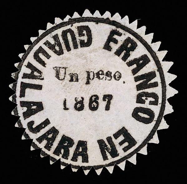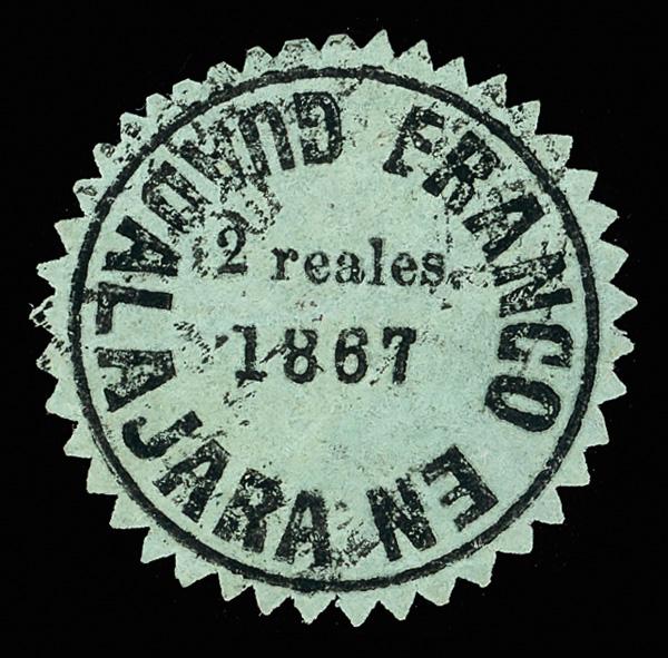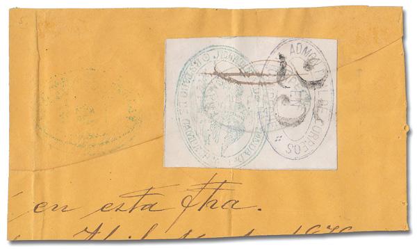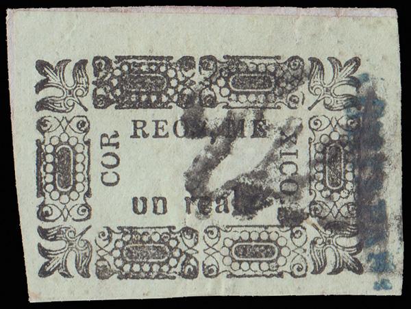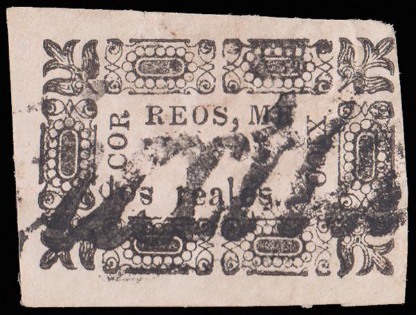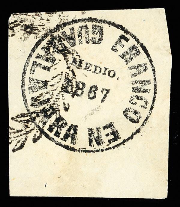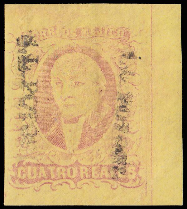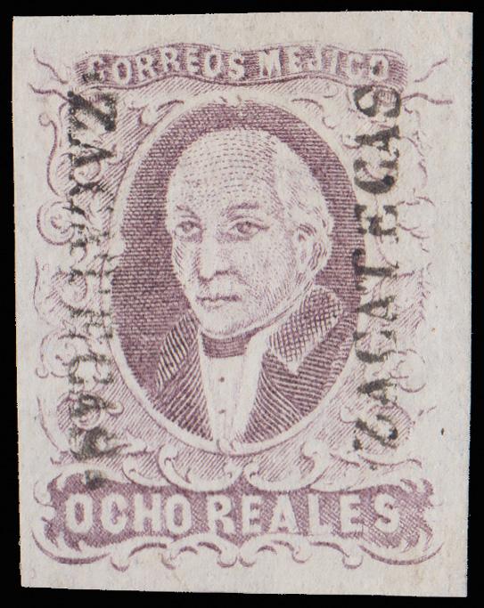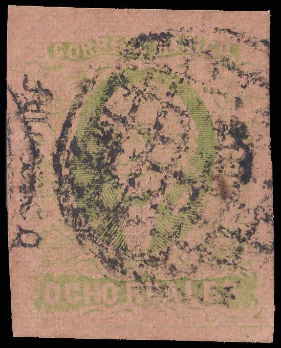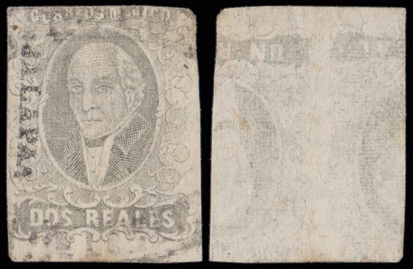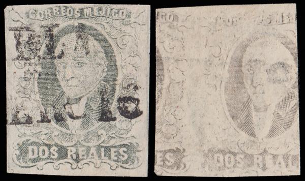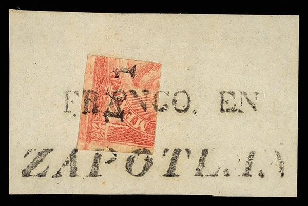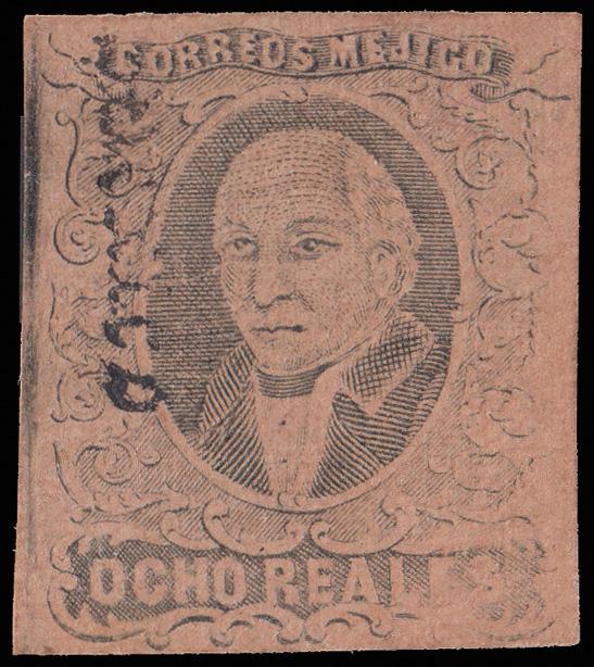 1861, Second Issue, 2r black on pink, impression of 1r on reverse (Scott 8a),Jalapa district overprint, large bottom margin but touching on the other sides, Very Good to Fine, with a 1981 M.E.P.S.I. certificate. Follansbee $400. Scott $2,000 for unused. (Image)