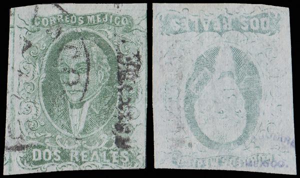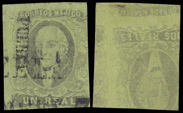 1861, Second Issue, 1r black on green, impression of 2r on reverse (Scott 7a),Puebla district overprint, an attractive used example, two large margins, touching on two sides, impression of 2r printed upside down on the reverse, Very Fine and rare, with a 1979 M.E.P.S.I. certificate. Scott $1,000. (Image)