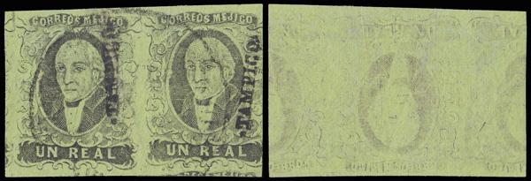 1861, Second Issue, 1r black on green, printed on both sides (Scott 7 var.),Tampico district overprint, a fresh, attractive horizontal pair with three large margins (just touching at the right) and a light cancel, Very Fine. Formerly listed as Scott 7c, with a 1981 M.E.P.S.I. certificate. Follansbee $600 as singles. (Image)