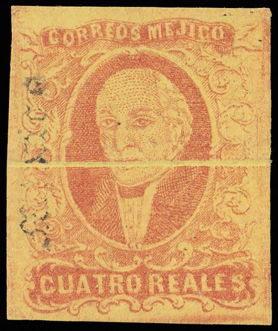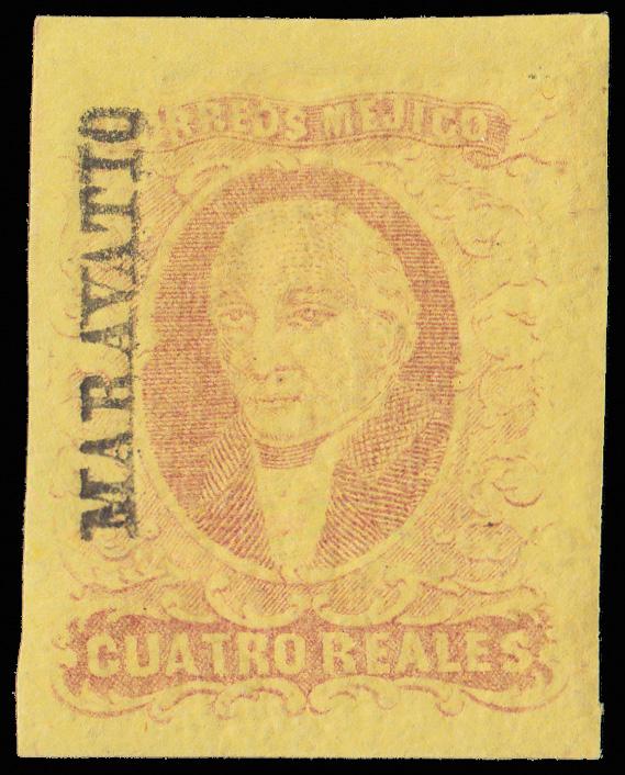 1861, Second Issue, 4r dull rose on yellow (Scott 10),Maravatio district overprint, an extraordinary mint example, o.g., lightly hinged, incredibly fresh with exceptional margins all around, Extremely Fine to Superb. A rare district on the 4r value, signed "WES" (Shelton), with a 1984 M.E.P.S.I. certificate. Follansbee $800. Scott $200+. (Image)