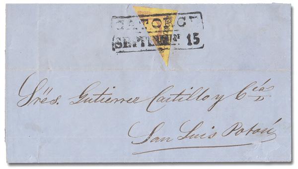 1861, Second Issue, 4r dull rose on yellow, bisect (Scott 10a), diagonal half with a S.L. Potosi district overprint tied by a boxed "CATORCE" cancel, Sep 15, 1862 on a 1861 folded letter to S.L. Potosi; cosmetically refolded with minor flaws, Very Fine appearance (stamp Very Fine), with a 1976 M.E.P.S.I. certificate. Scott $950. (Image)