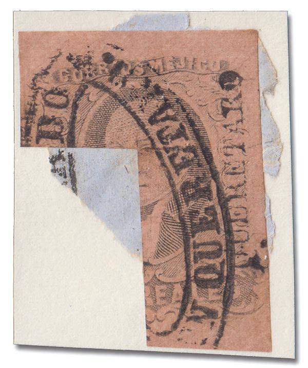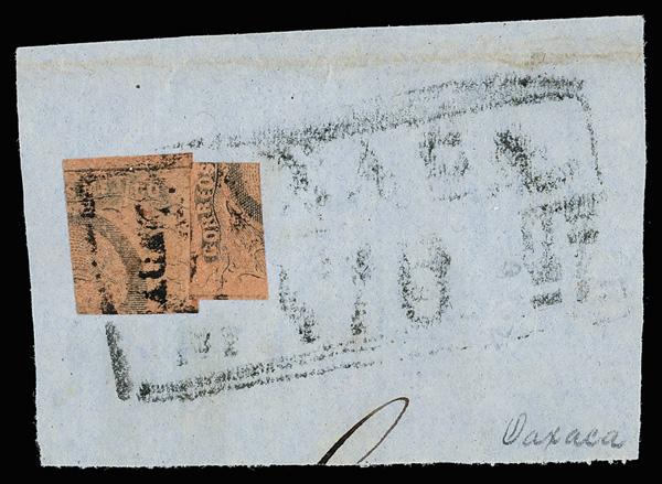 1861, Second Issue, 8r black on red brown, quadrisect & octasect (Scott 11a, 11b), 1/8 & 1/4 used as 3r, tied together onto a small piece by a somewhat light boxed "OAXACA/ MAYO ?" cancel (Schatzkès 1023), Very Fine and exceedingly rare, with a 1979 M.E.P.S.I. certificate. Follansbee $3,750 for the 1/8 used on piece. (Image)