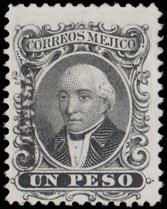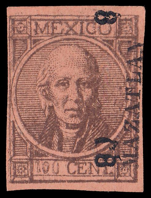 1868, Hidalgo (thin figures, imperf), 100c brown on brown (Scott 51),Mazatlan district overprint, consignment no. 8-68, unused without gum, fresh and clean with clear to mostly large margins, Fine to Very Fine, signed Aguirre, with a 1983 M.E.P.S.I. certificate. Scott $1,750 for o.g. (Image)