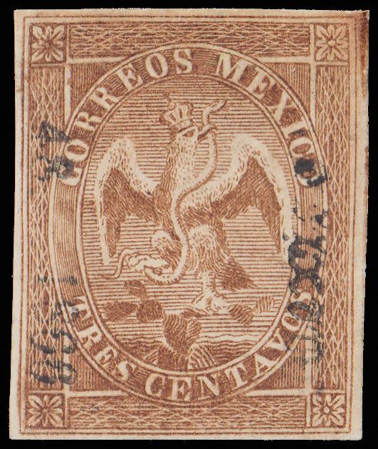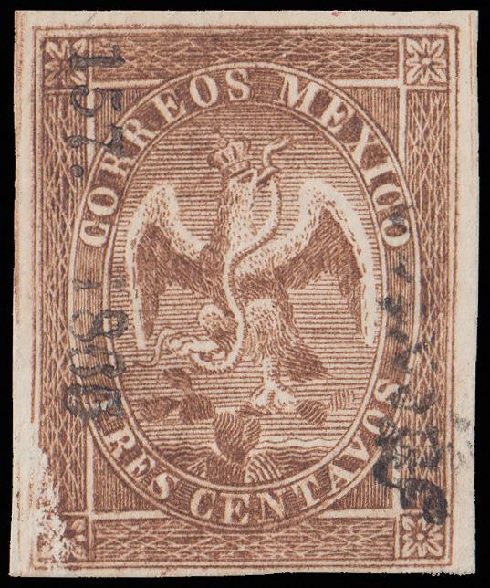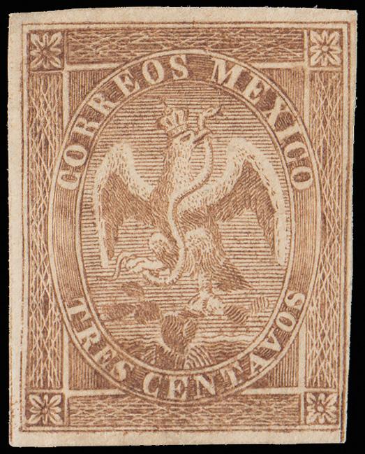 1865, Eagle (4th Period), 3c brown, laid paper (Scott 18b),Mexico district overprint, consignment no. 137-1865, sharp impression, unused without gum, three small margins and just into outer frame line at the bottom, Fine and rare, with 1997 M.E.P.S.I. & 1972 R.P.S.L. certificates. Scott $4,500. (Image)