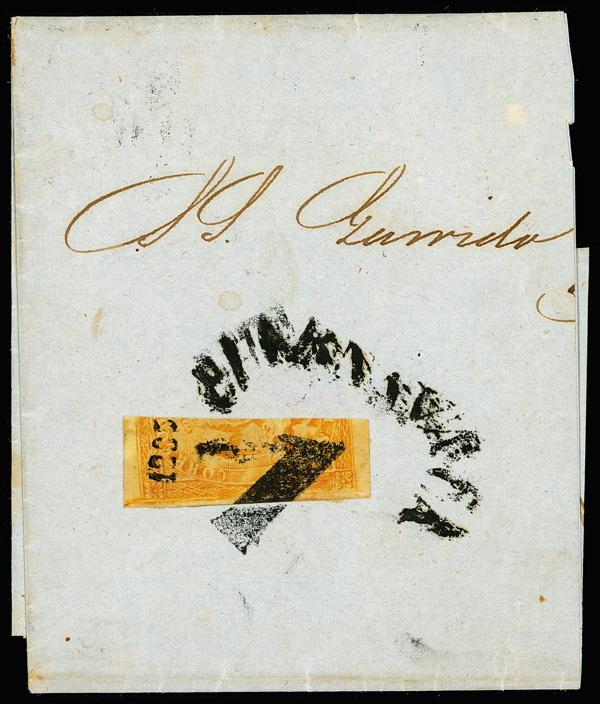 1864-66, Eagle, 2r orange bisect (Scott 23e), left vertical half with full "1865" date used as 1r and tied on a large piece of a folded letter by a bold, somewhat blurry "CUERNAVACA/1" rimless oval (similar to Schatzkès 216), Very Fine. Scott prices a full cover at $6,000. Ex-Aguirre & Honeywell where it was offered "as is". Follansbee $800. (Image)