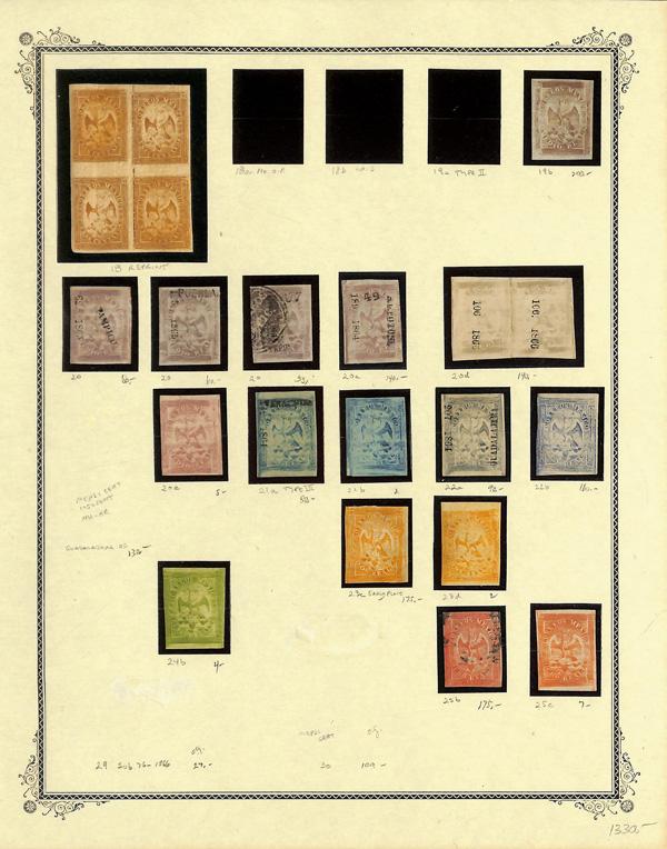Specialized Collection of the 1864-66 Eagle Issue (Scott 18/25). Five blank pages containing 49 items - singles & blocks - 19 of which have M.E.P.S.I. certificates; highlights include (unused without gum unless noted) #19b, 20a, 20b, 23c, 24d (used on piece, Follansbee $150), 25a (o.g.) & 25b, all with M.E.P.S.I. certificates; F-VF throughout. Shipping charges apply - weight 0.8 lbs. Scott $3,150. (PDF for this Lot) (Image)
