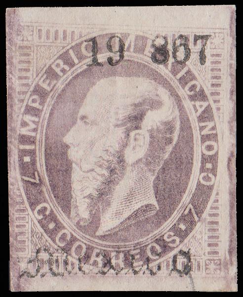 1866, Emperor Maximilian (engraved), 7c lilac (Scott 31),Mexico district overprint, consignment no. 19-867, o.g., clear to mostly large margins, Very Fine, signed Em. Diena, with a 1986 M.E.P.S.I. certificate. Scott $450. (Image)