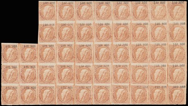 1866, Emperor Maximilian (engraved), 25c orange brown (Scott 33), a marvelous mint block of 46, consignment no. 140-866, o.g., never hinged, bright and fresh with margins virtually all around; light vertical crease through the three left stamps, a Very Fine and scarce large multiple. Scott $552 as singles. (Image)