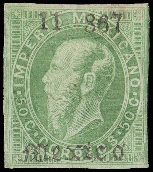 1866, Emperor Maximilian (engraved), 50c green (Scott 34),Mexico district overprint, consignment no. 11-867, o.g., bright and fresh with nice margins all around, Very Fine, with a 1988 M.E.P.S.I. certificate. Scott $700. (Image)