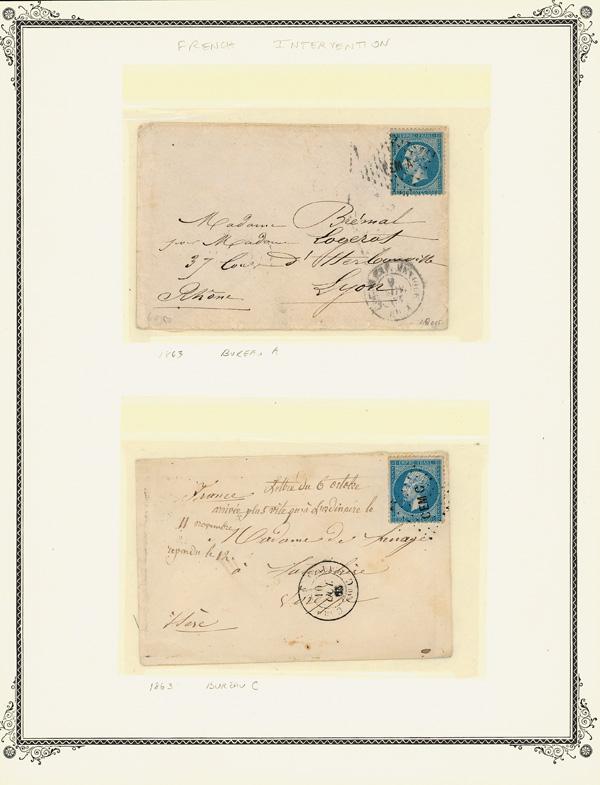 1863-65, French Expeditionary Forces, five different, 1.) Bureau A, 20c 1863 to Lyon; 2.) Bureau C, 20c 1863 to Voreppe; 3.) Bureau D, 10c & two 20c 1865 to Saintes; 4.) Bureau E, 10c & two 20c 1864 to Strasbourg; and 5.) Bureau F, 20c 1865 to Strasbourg; the last with a M.E.P.S.I. certificate; markings vary from poor (Bureau D) to F-VF; covers all F-VF. (Image)