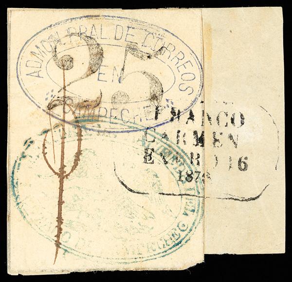 1864-66, Eagle, 8r red, quarter used as 2r (Scott 25f), upper left quarter with consignment number 151 (2nd Period), tied on a small piece by a neat "FRANCO EN/ ZAPOTLAN" straightline (Schatzkès 441), Extremely Fine. A rare "split"; Scott prices a full cover at $15,000, with a 1977 M.E.P.S.I. certificate. (Image)
