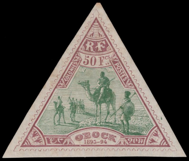 OBOCK, 1894, 50fr RED VIOLET & GREEN MINT, #64, full margins, o.g., lightly hinged, very fine, three older expert marks, cat. $1,000.00, Yvert #64 @ €1,200.00....US$400