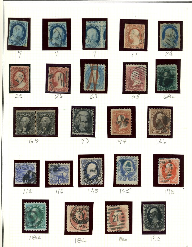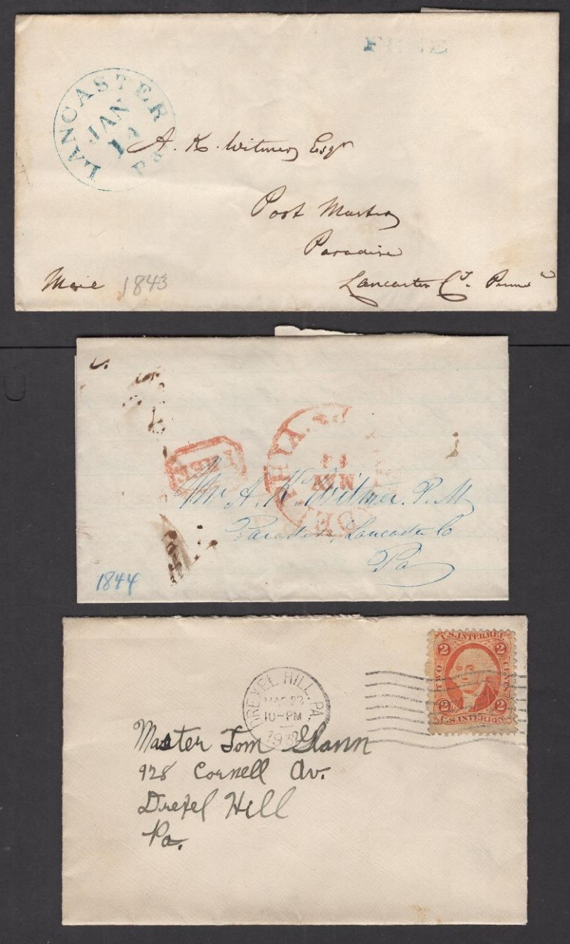 Group (94) stampless, over half from towns in Pennsylvania, others incl NY, IL, MI, DC; a couple ms pmks, incl red, black or blue cds, ms or hs rate markings, "PAID," etc; one congressman free frank, some typical faults or weak strikes but many strong cancels; F+ (Image)