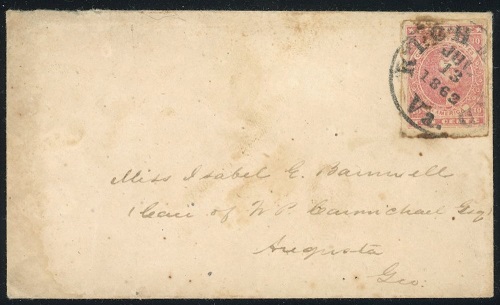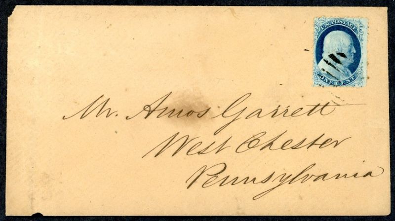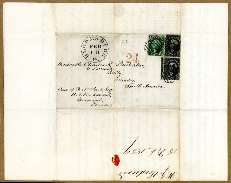 31, 36 Folded letter to Charles Buckalew, American minister to Ecuador at Quito, franked w/ Type I 10¢ and HZ pair 12¢, tied by May 26 (1860) Bloomsburg, Pa. pmk, red "24" hs and pen cancel; June 13 Panama British packet transit mark, to Guayaquil; very newsy letter discusses local business and political affairs, much regarding the Democratic Party Convention chaos at Charleston, letter mentions local political figures and their positions on Stephen Douglas, Lincoln, Buchanan, "Black Republicanism," Dred Scott, the upcoming Baltimore convention and more; Buckalew would later return home and serve as a Senator for Pennsylvania 1863-69; letter very readable, file fold does affect the 10¢ stamp; F+ (Image)