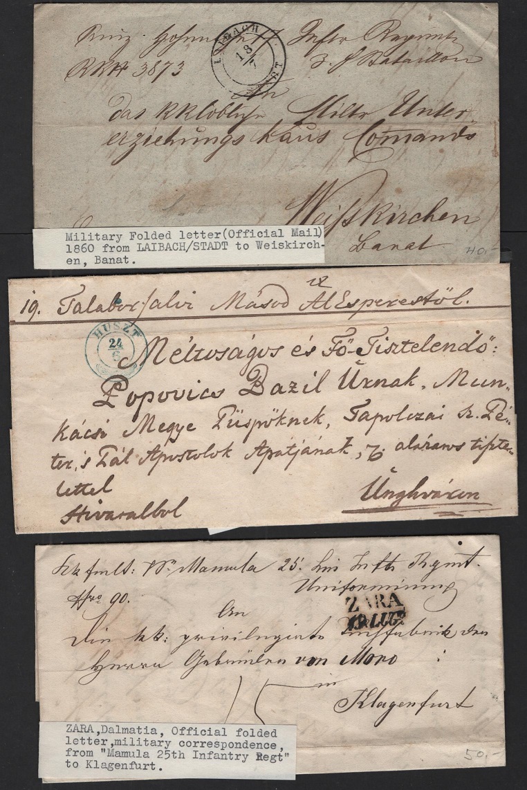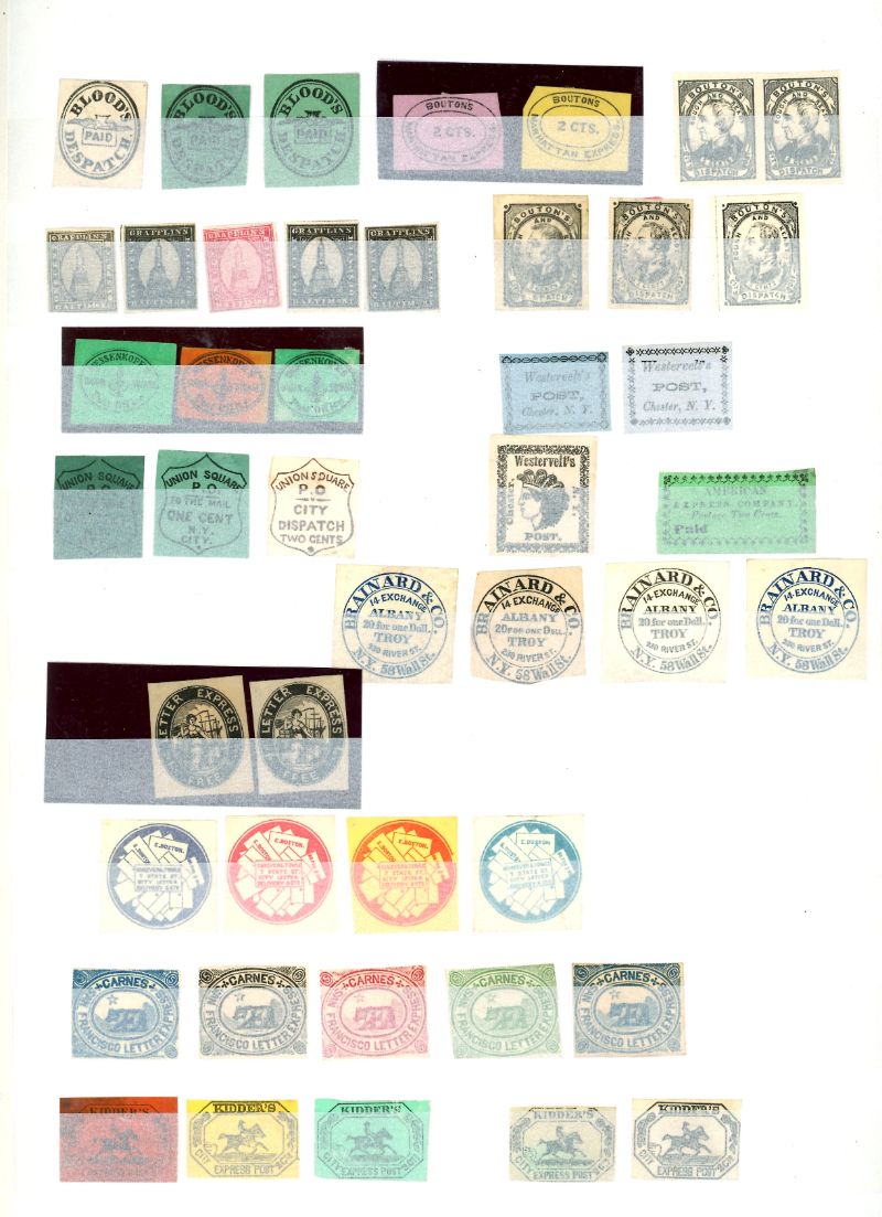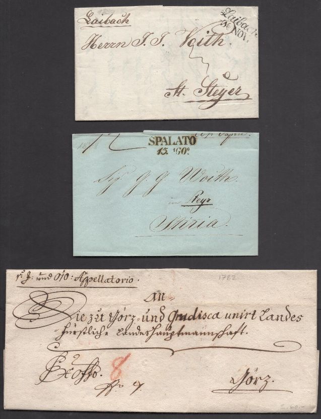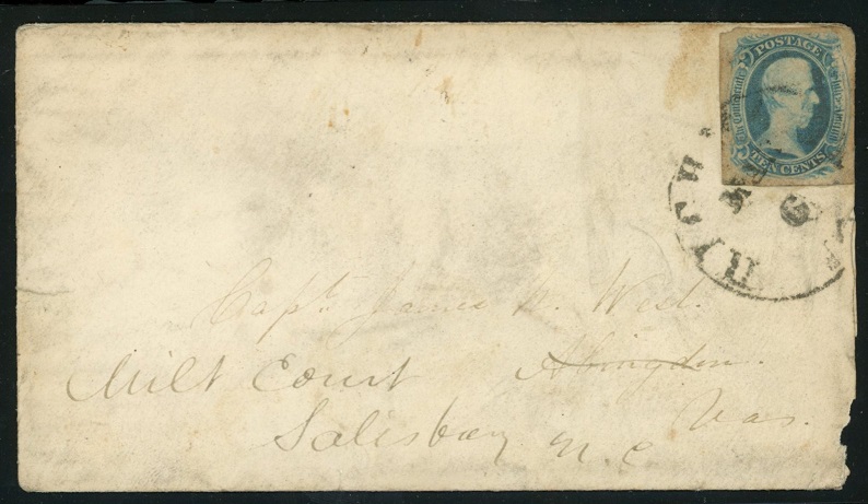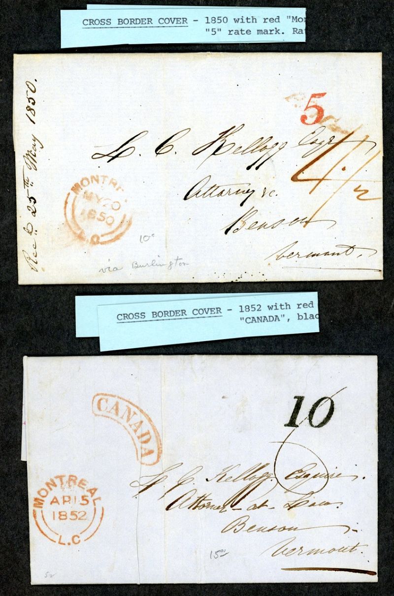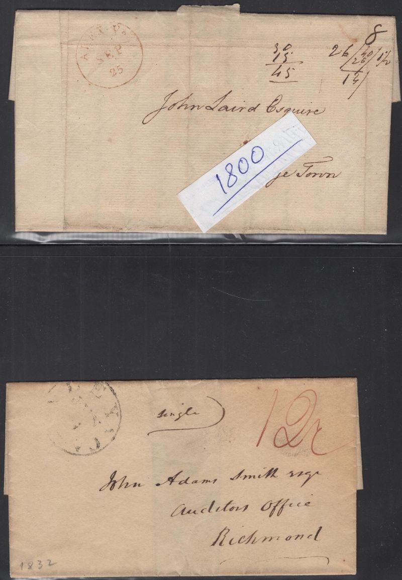 (32) mostly diff 1799-1851, good mix of states, rates, many smaller towns, few early ms towns etc, highlights incl: 1799 ms “Ex.” (Exeter) & 8 rate; 1801 letter w/ “8” rate, datelined York (Dist of Maine); 1817 Salisbury, Mass. ms w/ “6” rate; 1802 ms Ipswich (Mass.) & Postmaster free frank; 1814 red rimless Middletown CT; 1836 red Newport, RI “Ship” S/L on printed prices current; red and black Troy NY ovals; 1844 NY Express mail with 37-1/2 rate; 1846 Red Newbury, VT on Trans Atlantic; (3) small Ohio ms towns, 1831-44: Brown’s Mill’s (Postmaster free frank), Meig’s Creek, Middle Creek etc, gen Fine or better w/ some usual small flaws/faults, many unusual, impressive group (Image)
