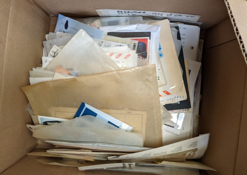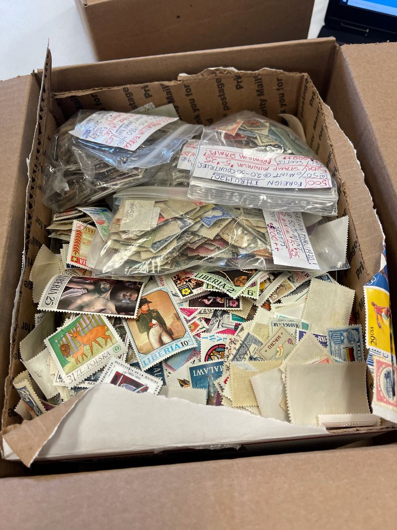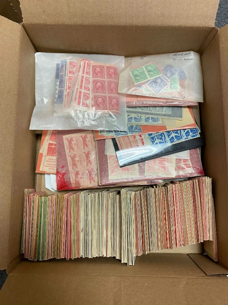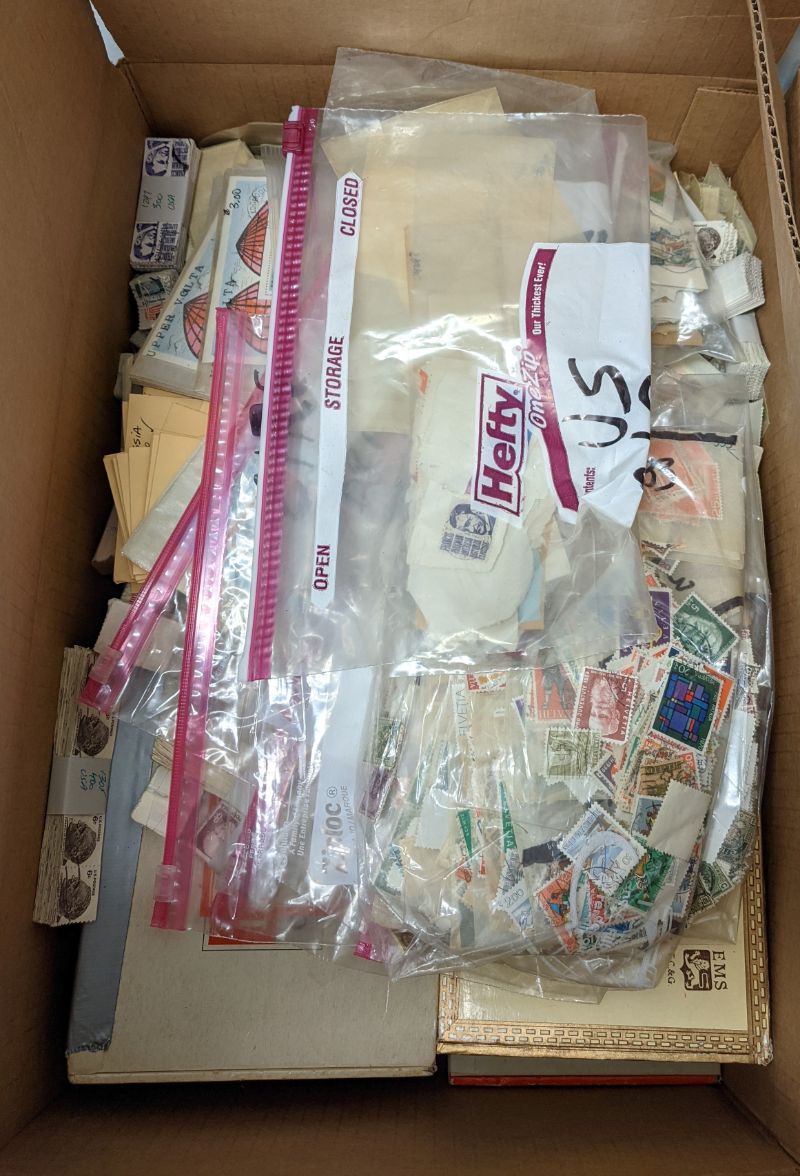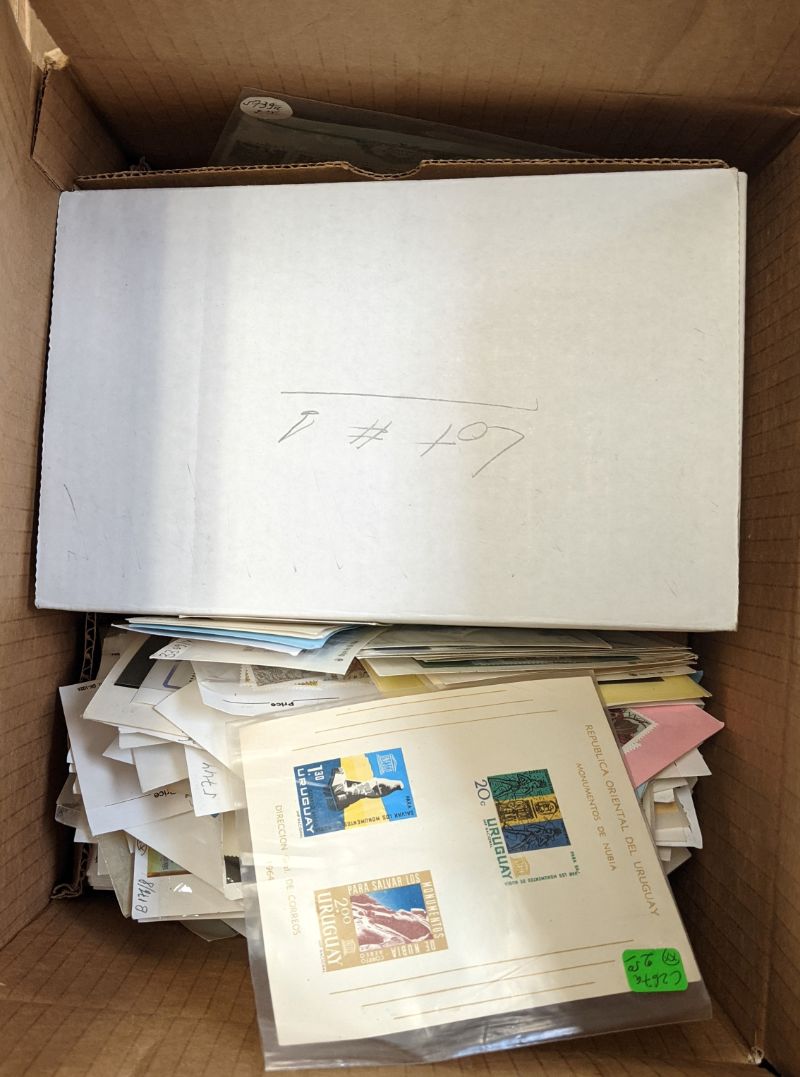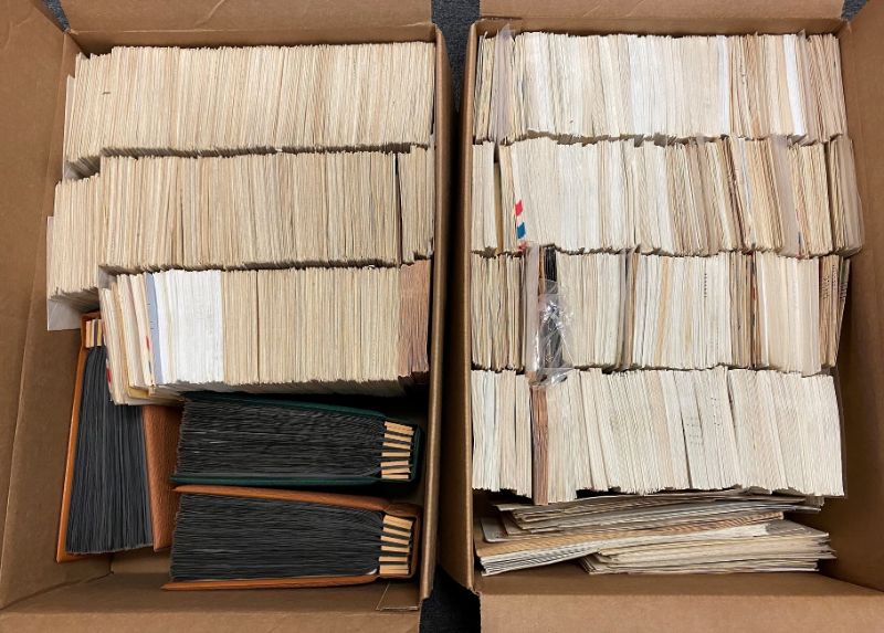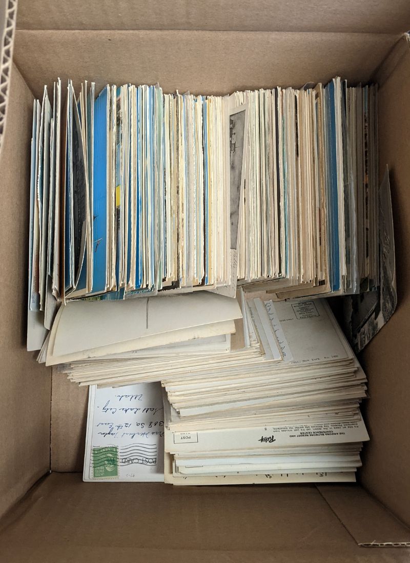 Huge unorganized stash of US & foreign PPC, loose, filling up (2) large ctns, accumulated over the years by a retired stamp dealer; all kinds of cards here: travel scenes, nature, greetings, holidays, RPC, PMC, vintage, white border, linen, early chrome, modern Continental, hotels, rack cards (not many), humor, art, foreign mostly Europe & Canada; many mailed, a few sleeved, expect some typical wear, gen F-VF