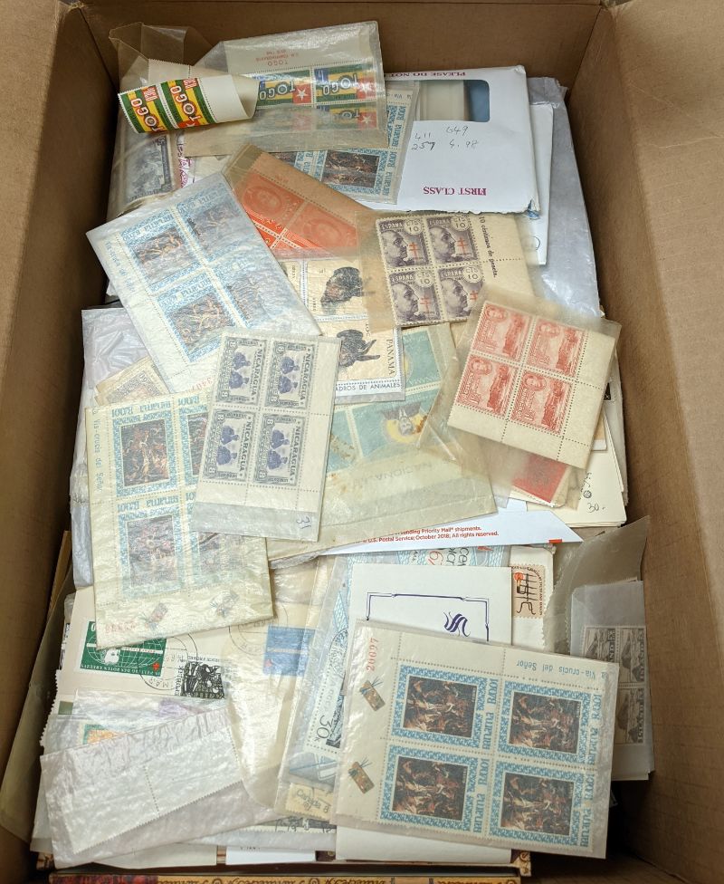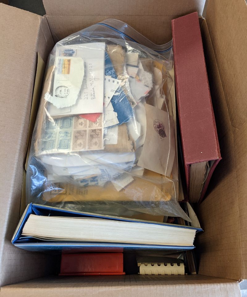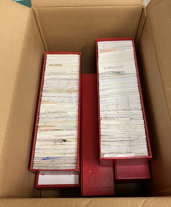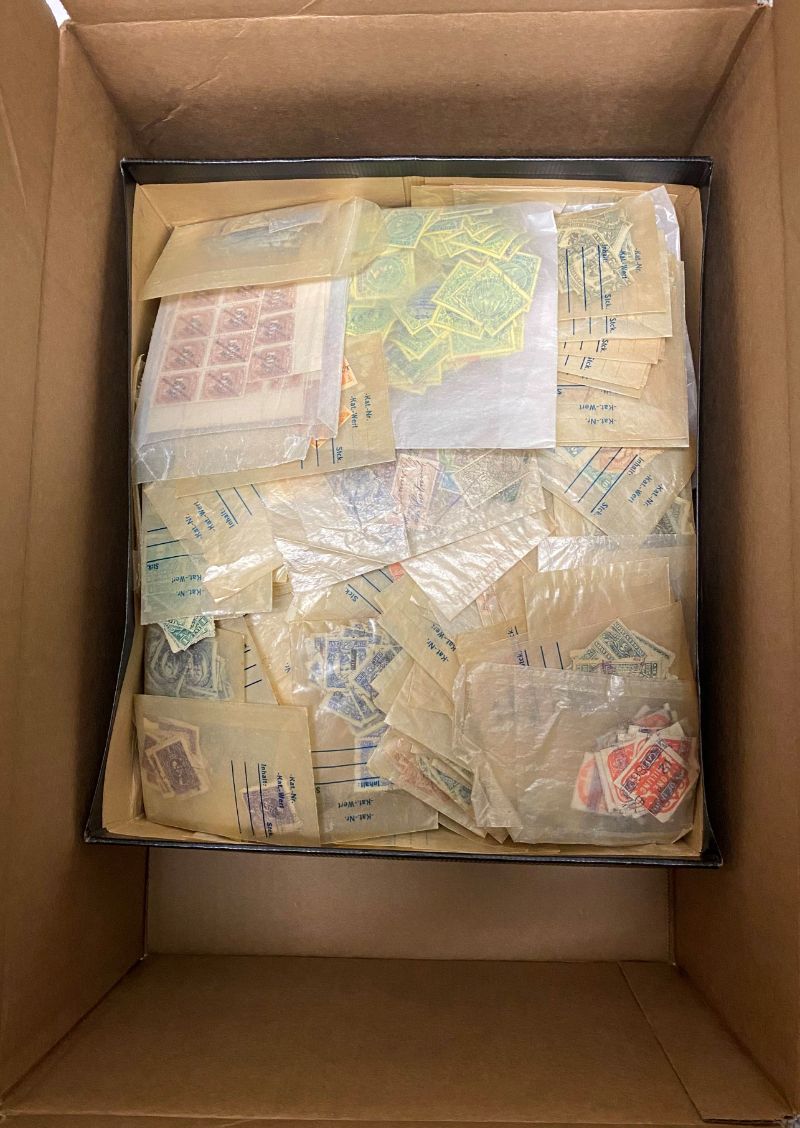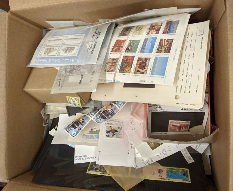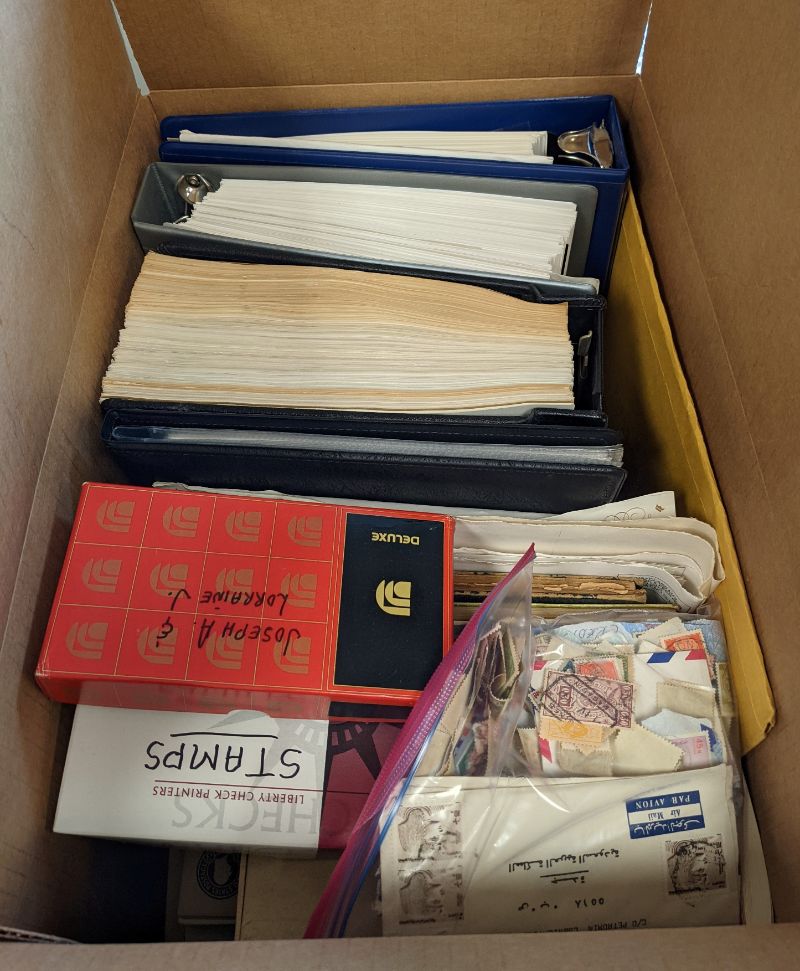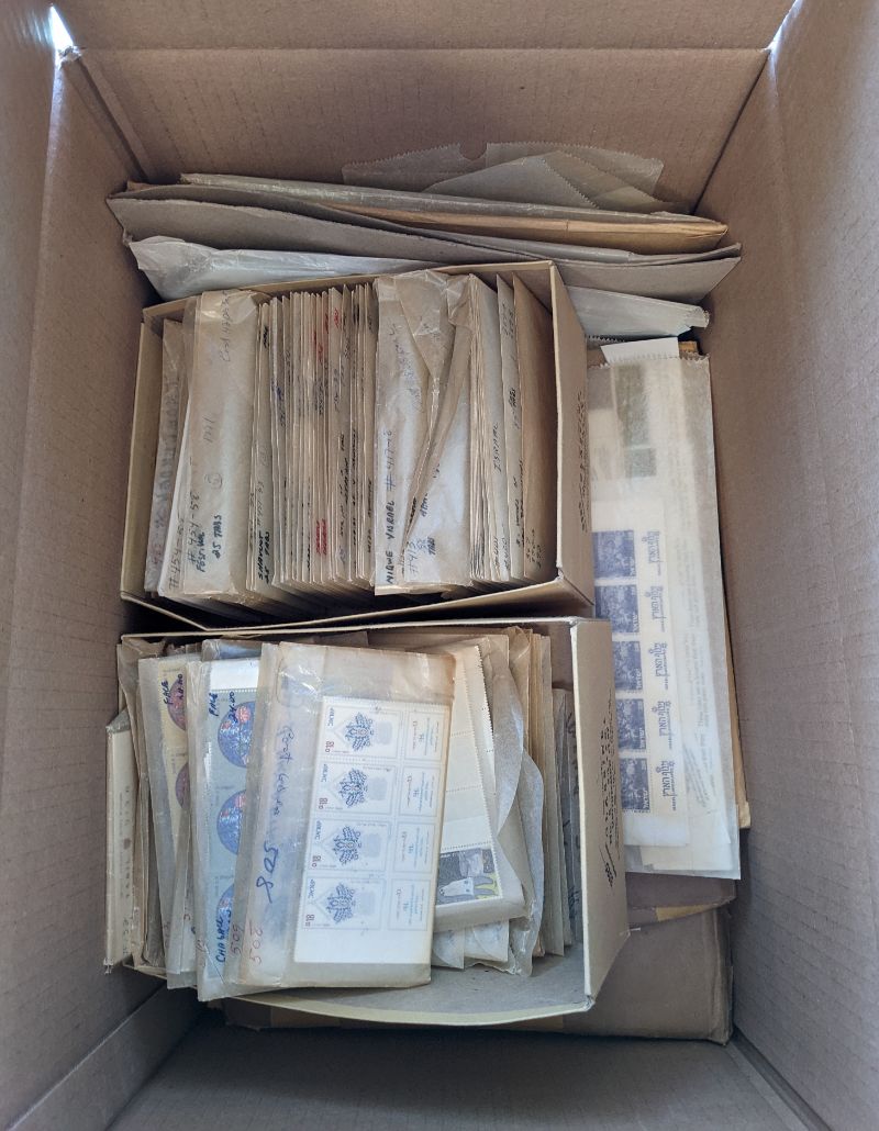 Huge unorganized stash of US & foreign PPC, loose, filling up (2) large ctns, accumulated over the years by a retired stamp dealer; all kinds of cards here: travel scenes, nature, greetings, holidays, RPC, PMC, vintage, white border, linen, early chrome, modern Continental, hotels, rack cards (not many), humor, art, foreign mostly Europe & Canada; many mailed, a few sleeved, expect some typical wear, gen F-VF