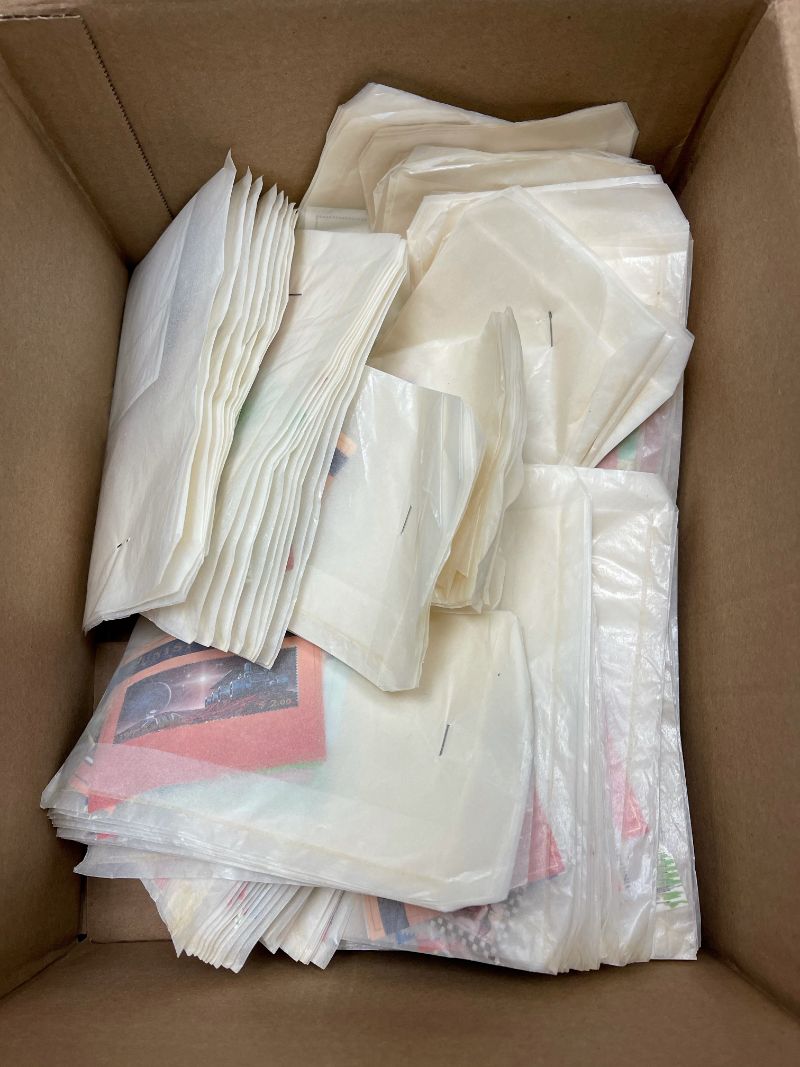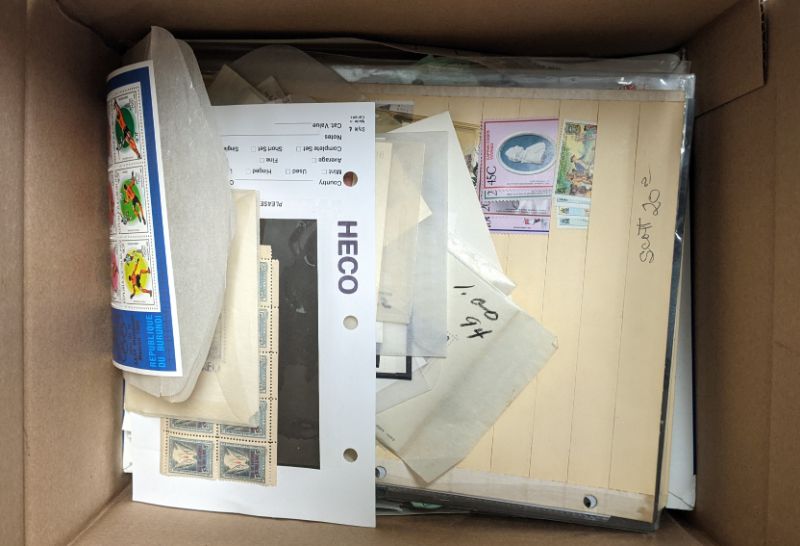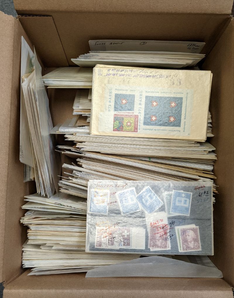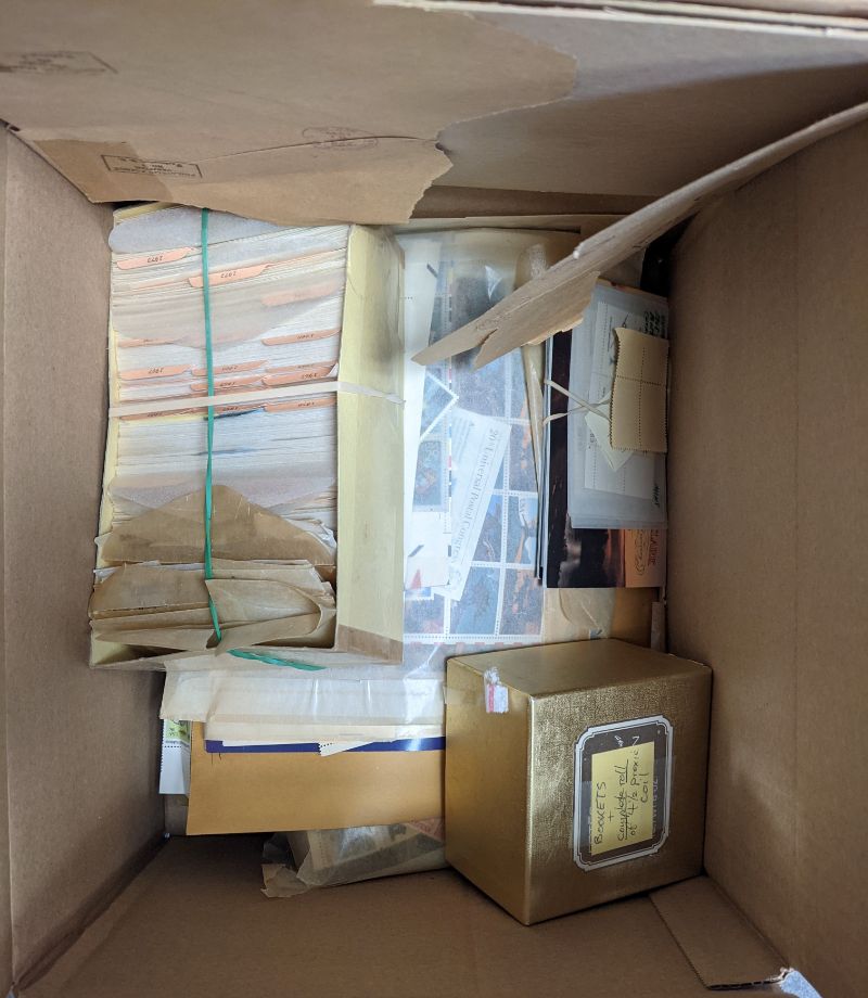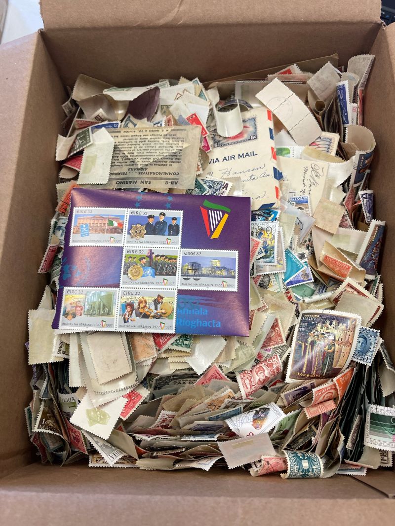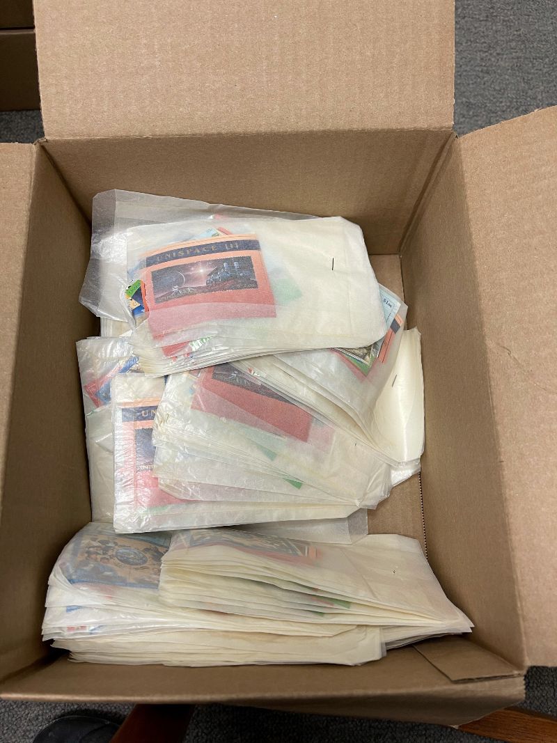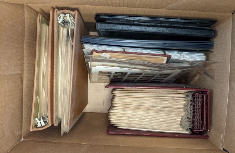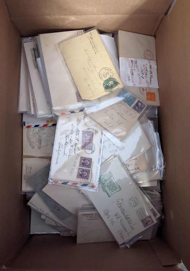 Huge unorganized stash of US & foreign PPC, loose, filling up (2) large ctns, accumulated over the years by a retired stamp dealer; all kinds of cards here: travel scenes, nature, greetings, holidays, RPC, PMC, vintage, white border, linen, early chrome, modern Continental, hotels, rack cards (not many), humor, art, foreign mostly Europe & Canada; many mailed, a few sleeved, expect some typical wear, gen F-VF