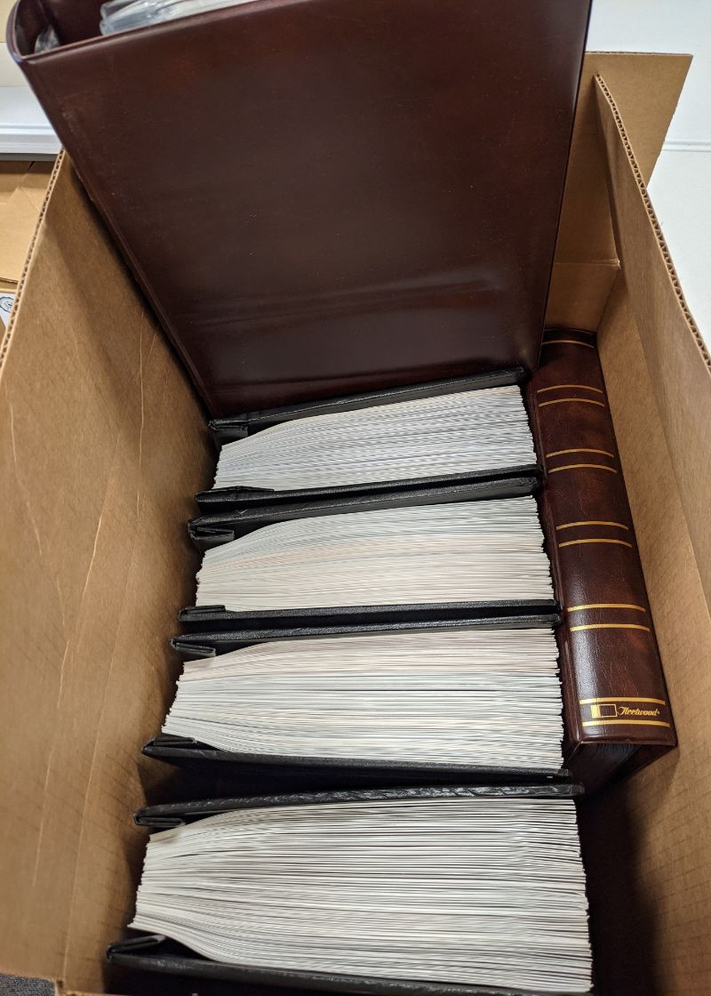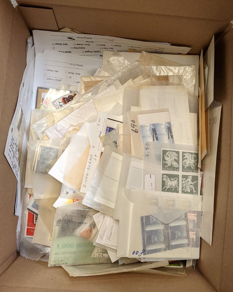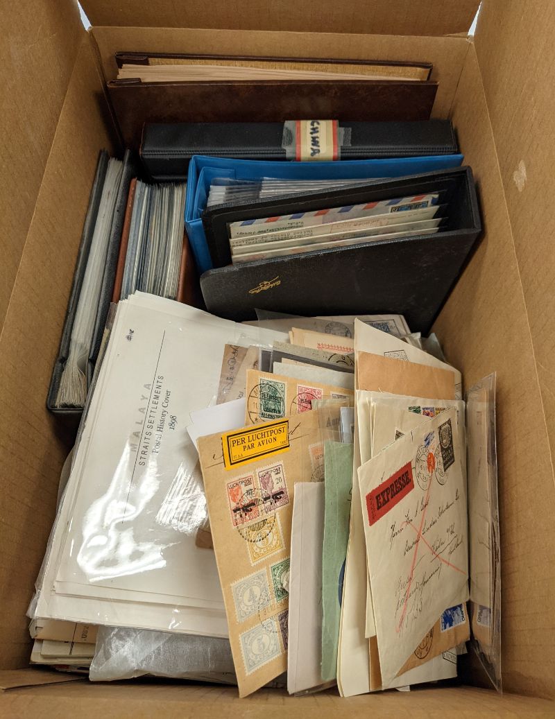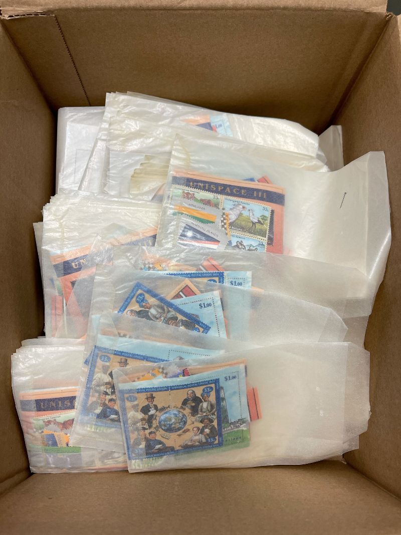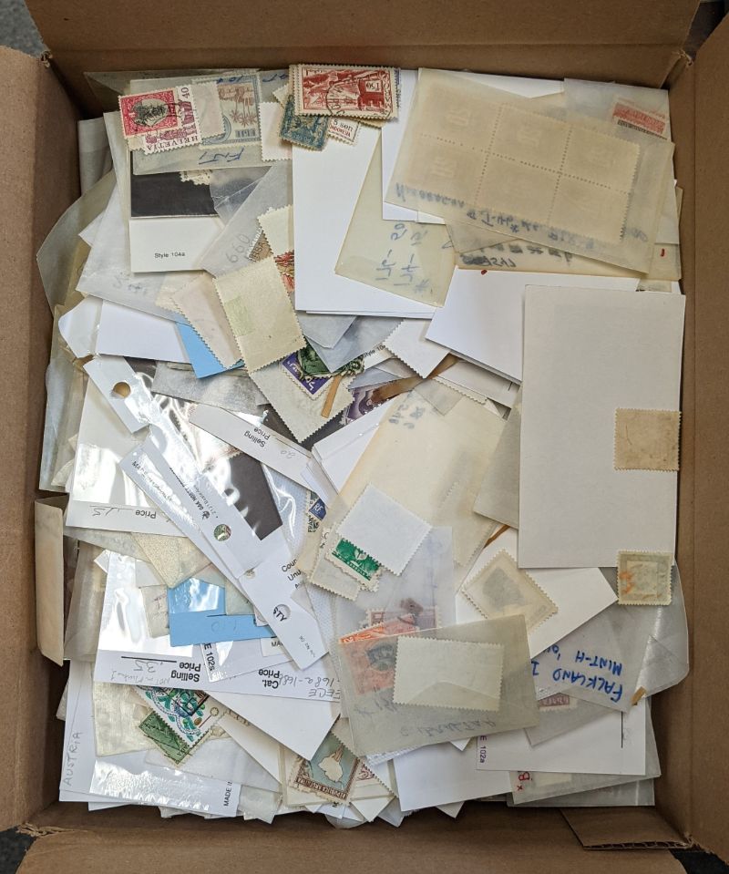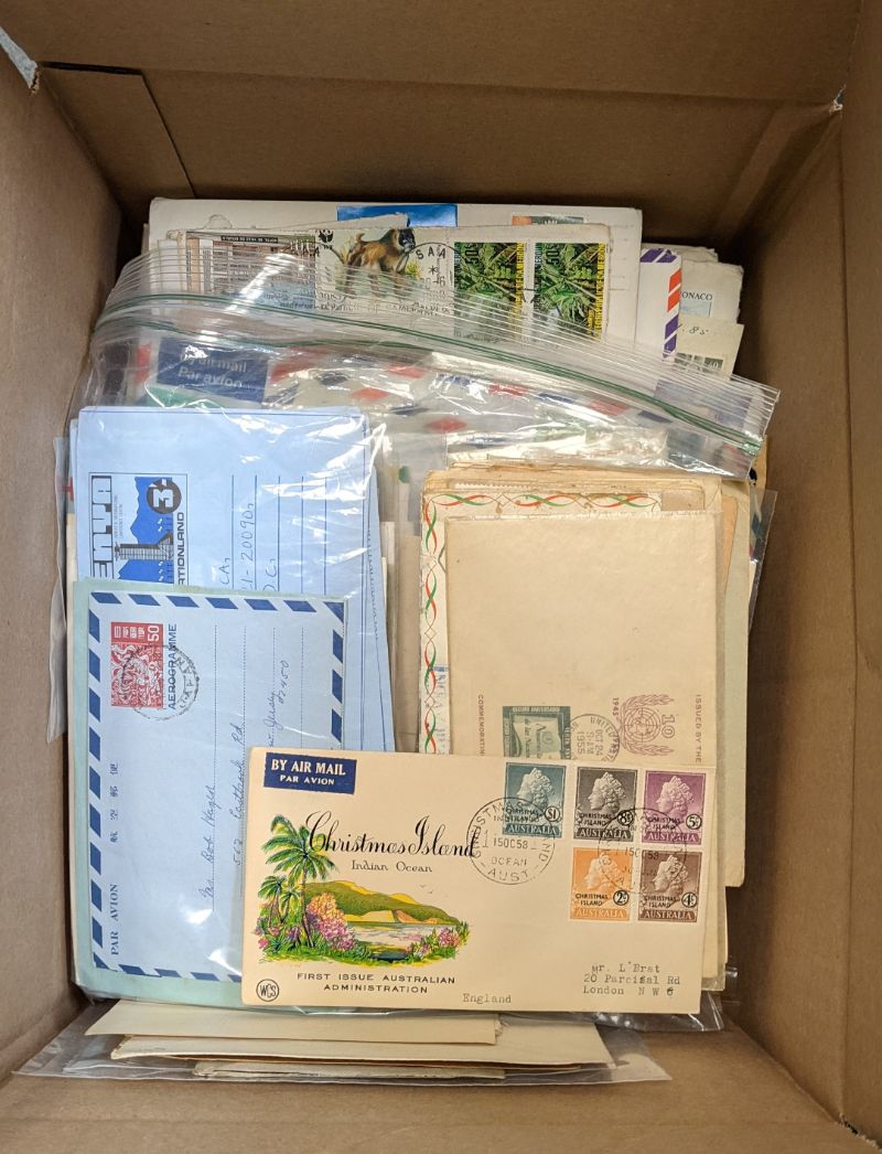 Huge unorganized stash of US & foreign PPC, loose, filling up (2) large ctns, accumulated over the years by a retired stamp dealer; all kinds of cards here: travel scenes, nature, greetings, holidays, RPC, PMC, vintage, white border, linen, early chrome, modern Continental, hotels, rack cards (not many), humor, art, foreign mostly Europe & Canada; many mailed, a few sleeved, expect some typical wear, gen F-VF