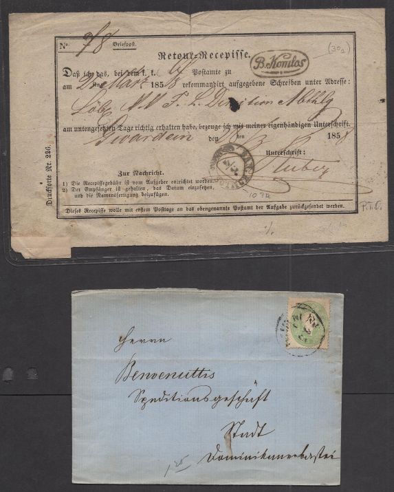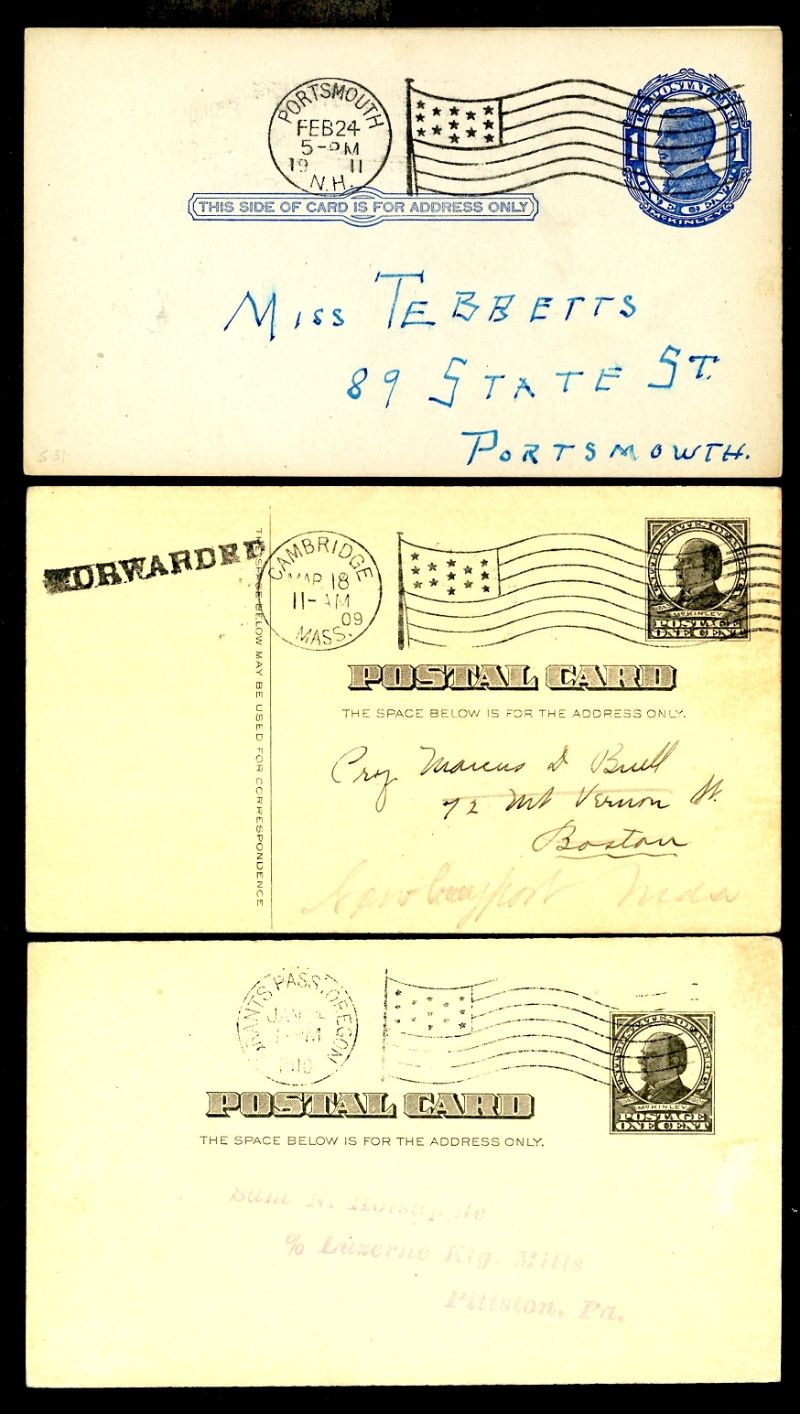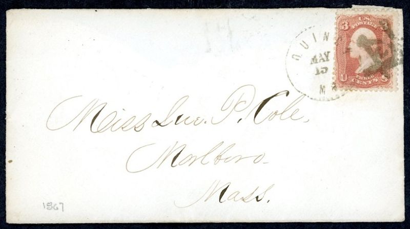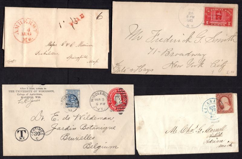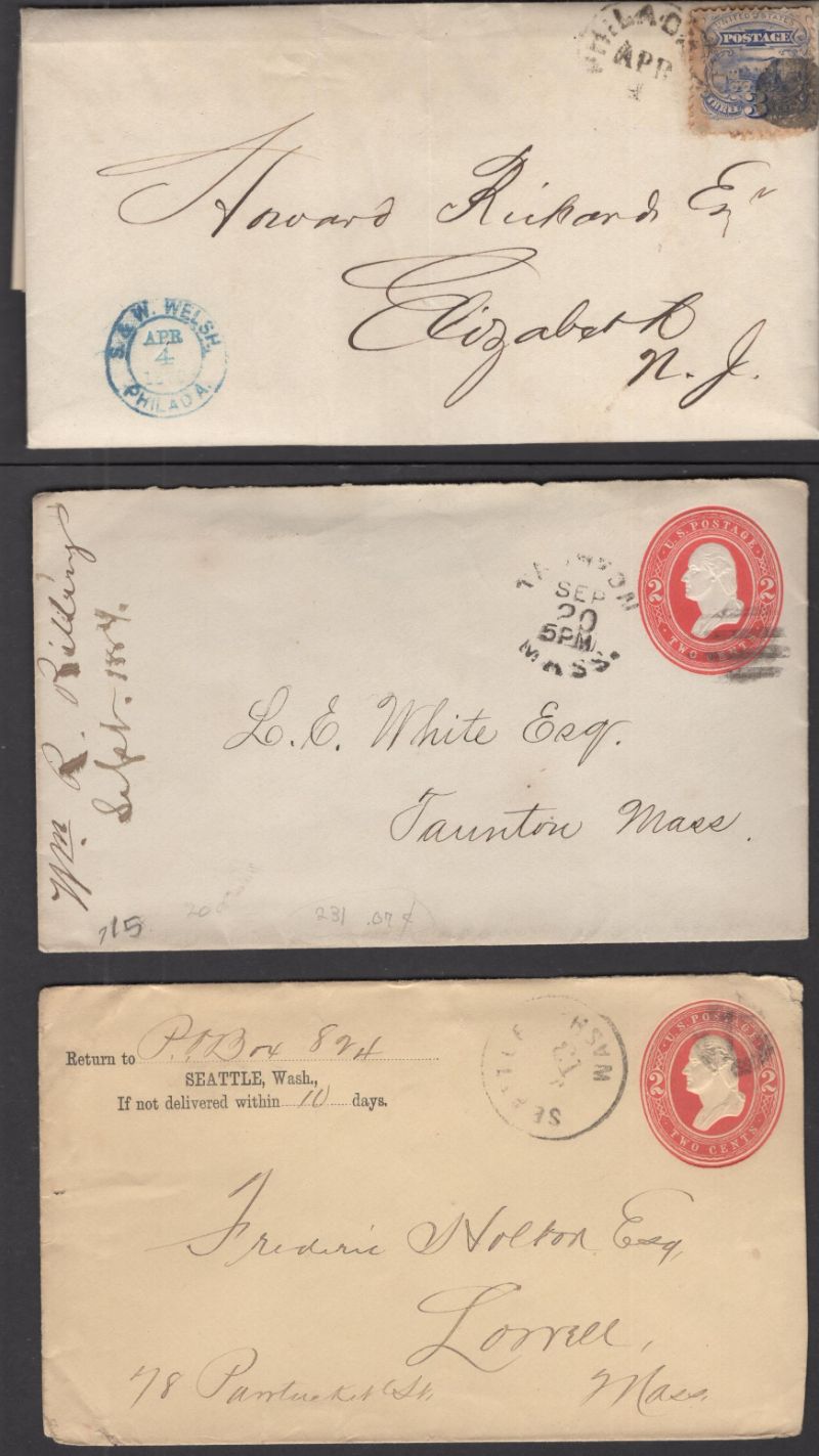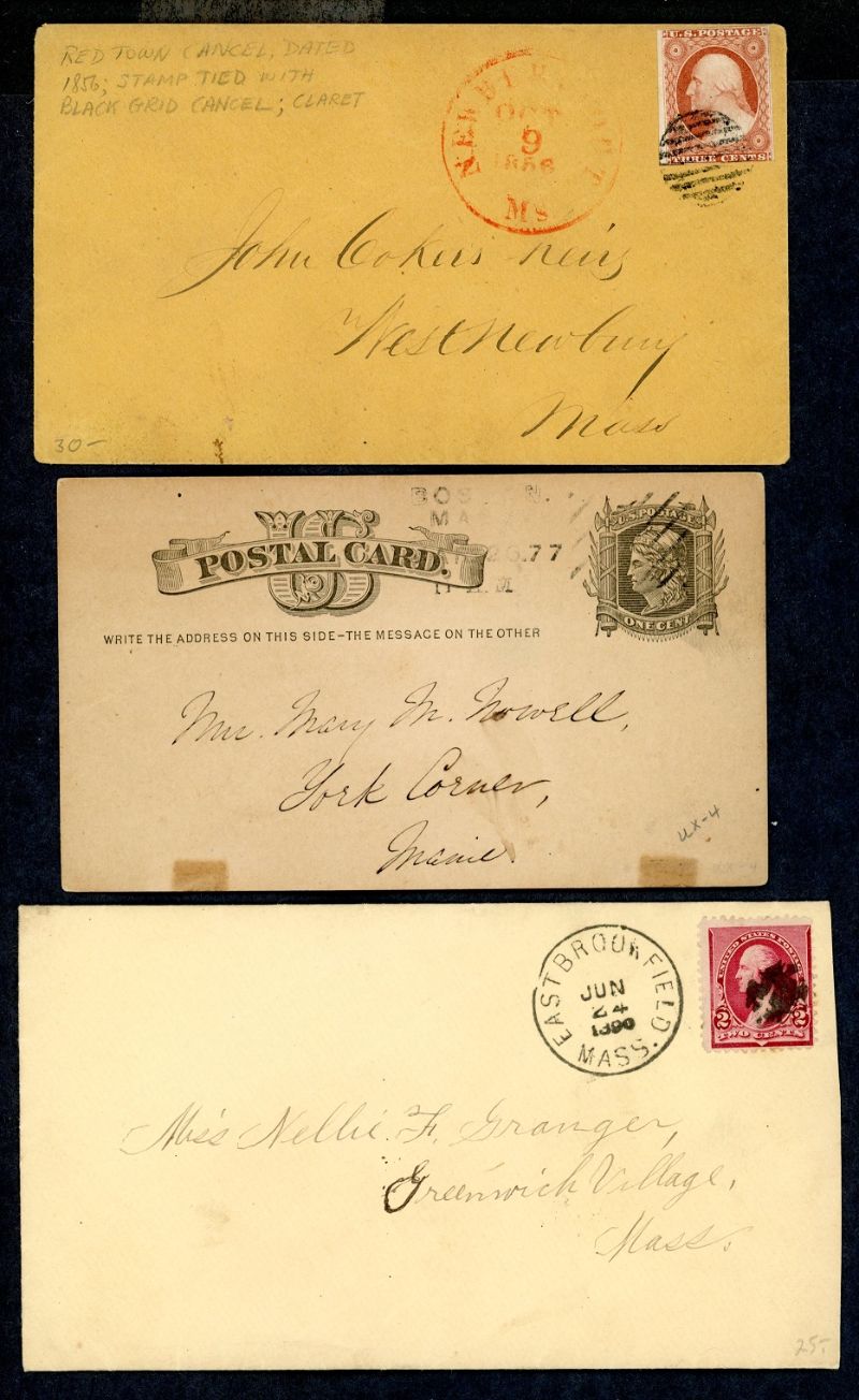 MASSACHUSETTS (21) covers plus (1) postal card 1851-1926 w/ early Leavitt machine cancel (scarce), several 1851-57 issues incl one orange brown (#10) w/ small Boston “Paid”, towns incl: East Brookfield (4), Newburyport (7) (1 red cds, all 1851 3¢), Taunton “greens” (2), Worcester blue on printed circular w/ large ornate “Paid 3”, 1926 #534A, Brookline, Mass, etc gen Fine or better, some unusual, decent grouping (Image)