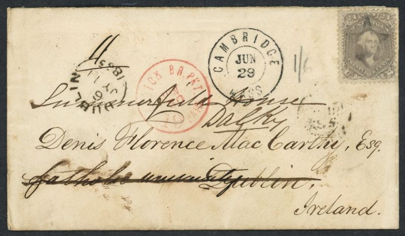 78 Star fancy cancel (not tied) w/ nearby 6/29 (1863) Cambridge, Mass cds, to Dublin, Ireland w/ Kingstown and Dublin receivers, red Boston "19" packet pmk; notation on back states that stamp has been replaced, small tears; F (Image)