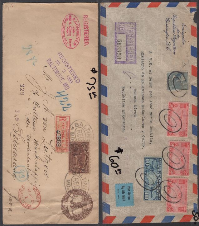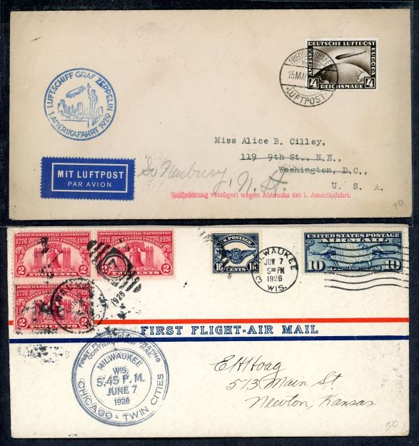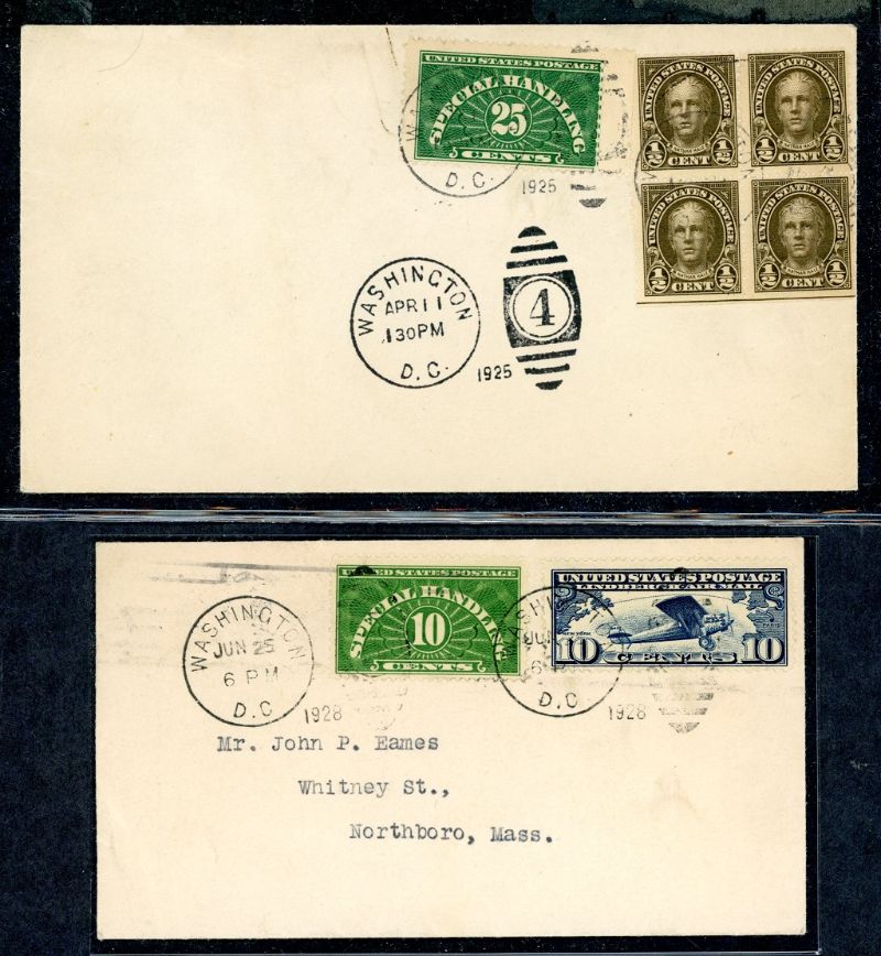 C5//C10 Selection (44) airmail covers 1925-29, in dealer annotated sleeves, franked mostly w/ all three Map issues or Lindbergh issue, also a C5, often other stamps added incl 4th Bureau or Special Delivery; comml, foreign destinations, auxiliary markings, more; some faults noted, gen F-VF (Image)
