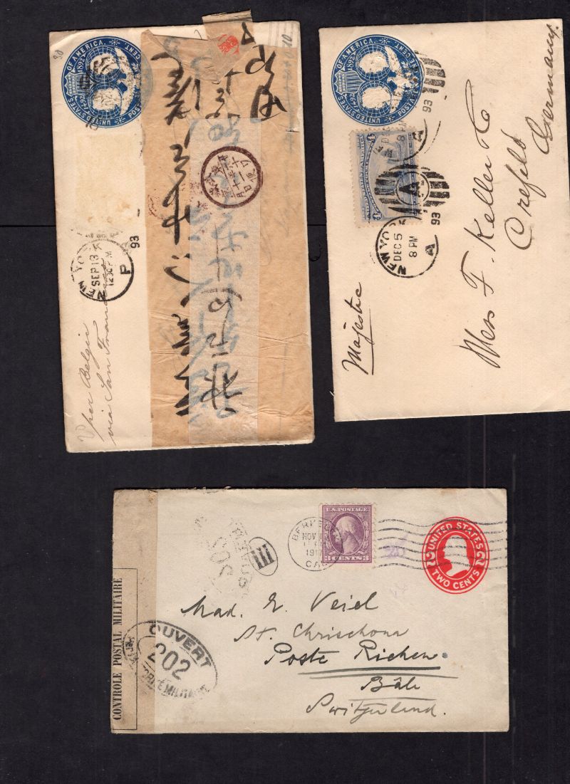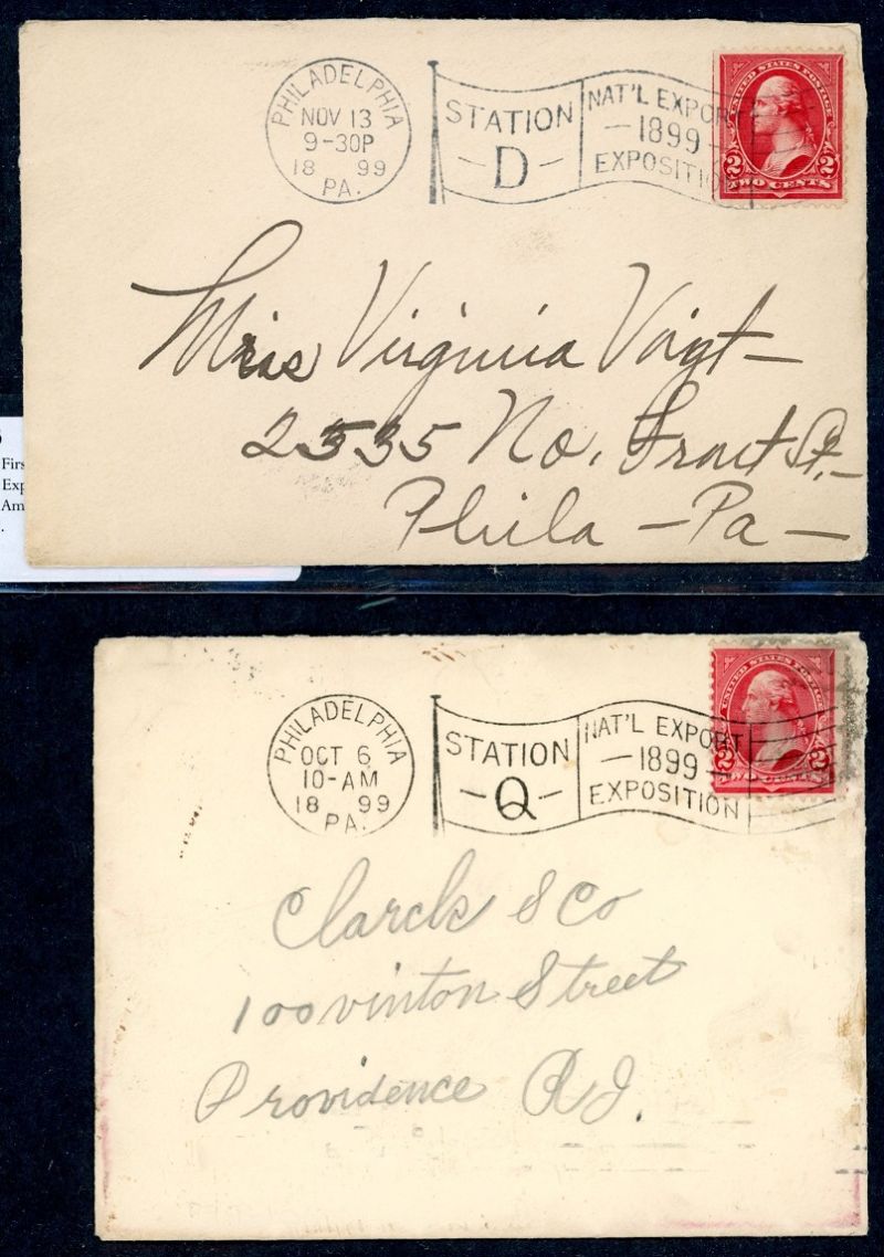 (22) covers w/ various machine cancels relating to the 1899 National Export Exposition in Philadelphia; stamped covers or entires, some corner cards or adv, flag machine cancels w/ diff numbers, diff Philadelphia Station letters (B, C, D, Q, S); some typical faults, couple w/ rough openings, gen F-VF (Image)