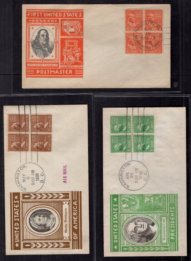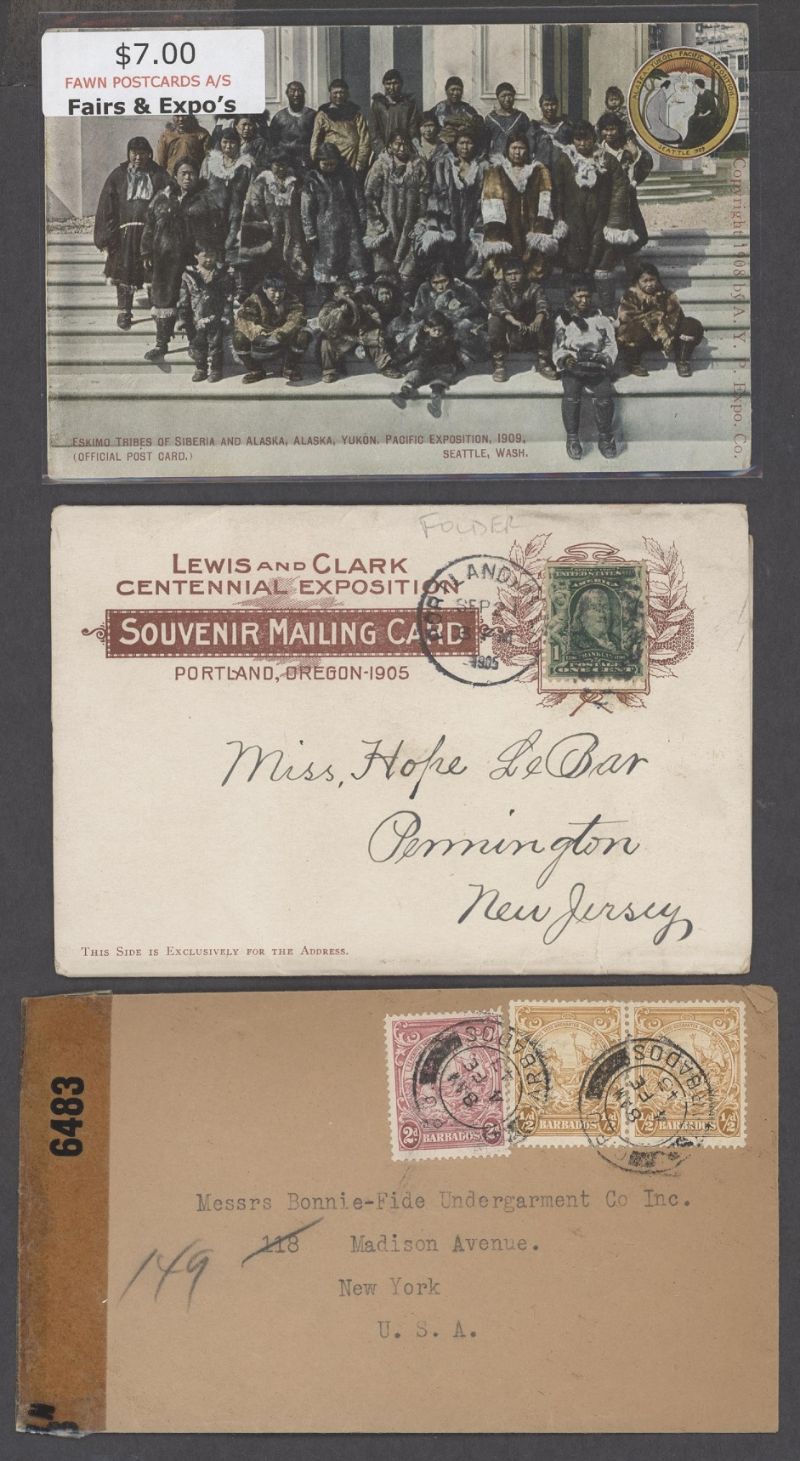 Abt (150) covers in dealer annotated sleeves, mostly from 1901 Buffalo up to 1939 New York, w/ a few earlier and later; covers mostly with expo related cancellations, although some w/ expo stamps, labels or cachets, company adv or corner cards, show emblems, PPC; machine cancels incl promotional pre-fair dated and current show station cancels; many identified by Bomar number; incl St. Louis ("1903" and "1904"), Jamestown, Seattle (all PPC), Panama-California, Panama-Pacific, Chicago, Texas Centennial, Golden Gate, and a couple others; a few minor faults, gen F-VF (Image)