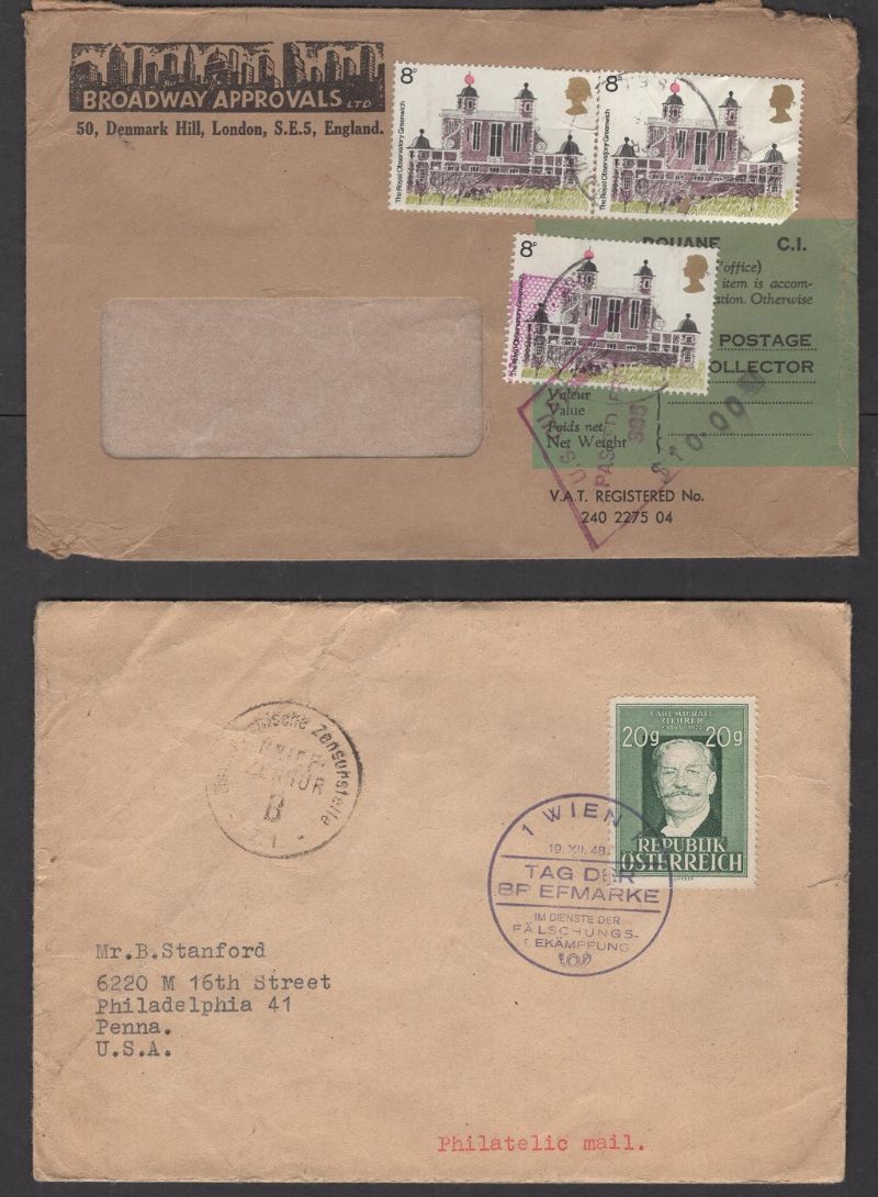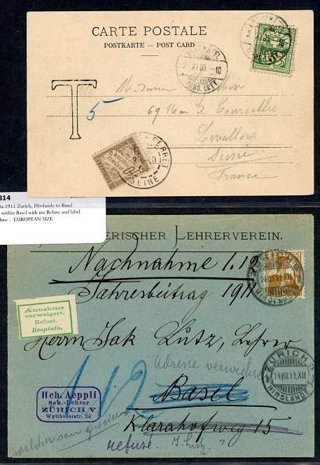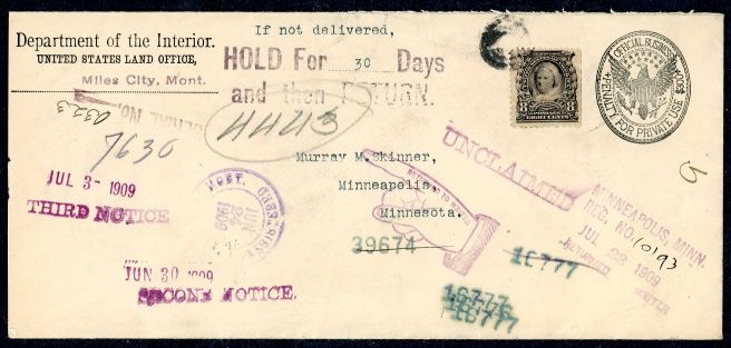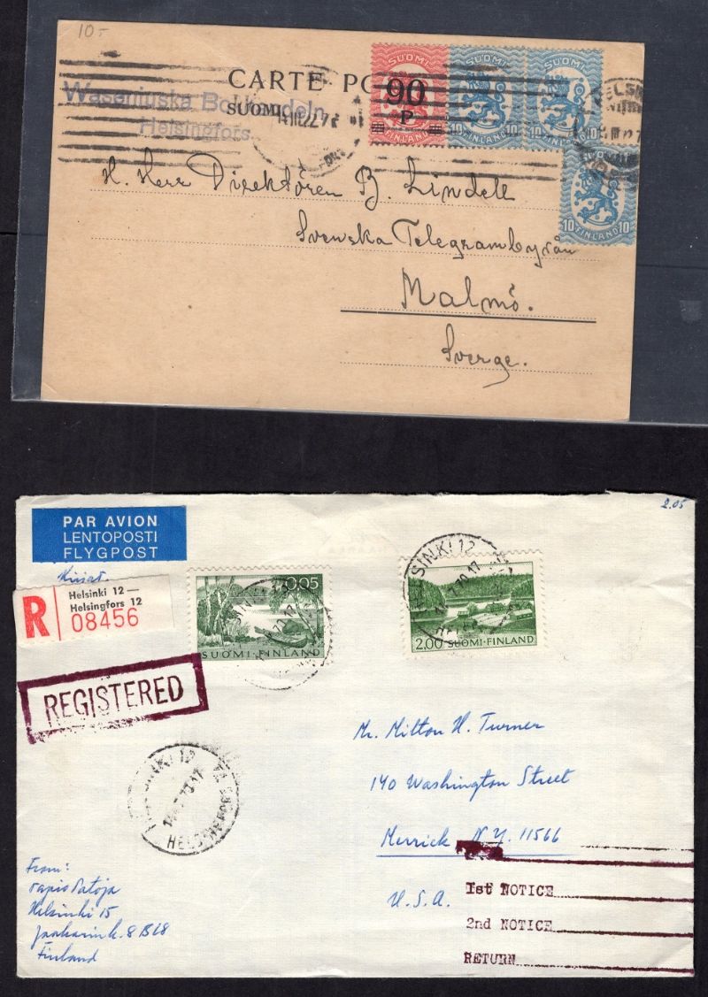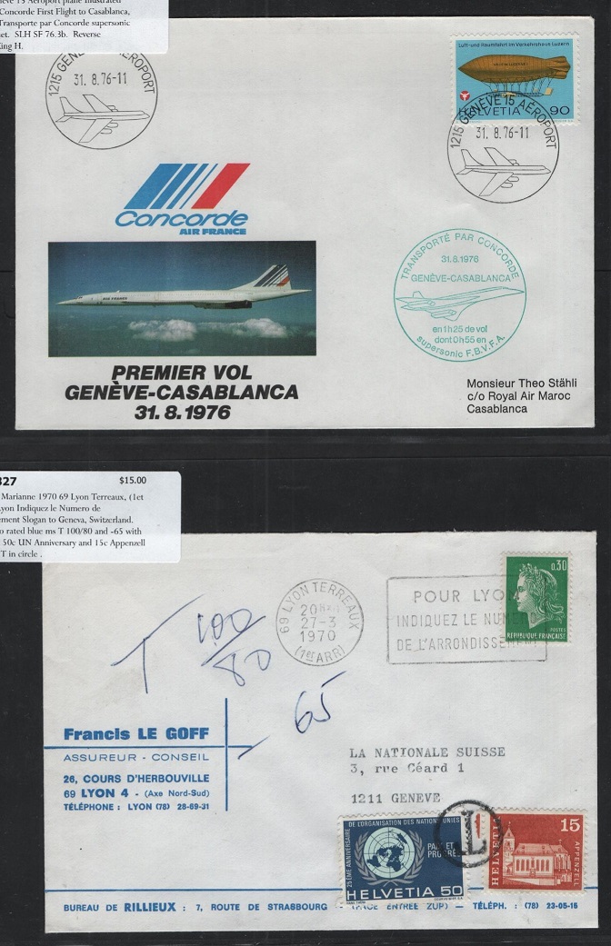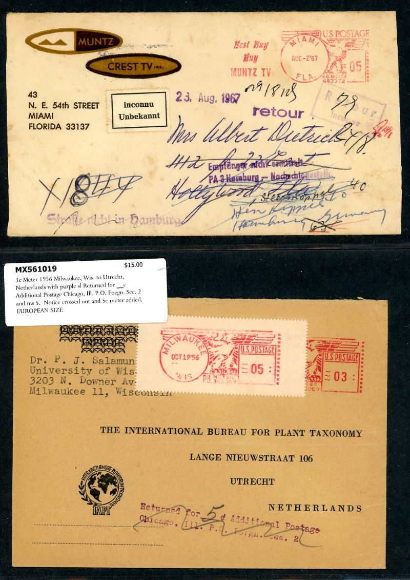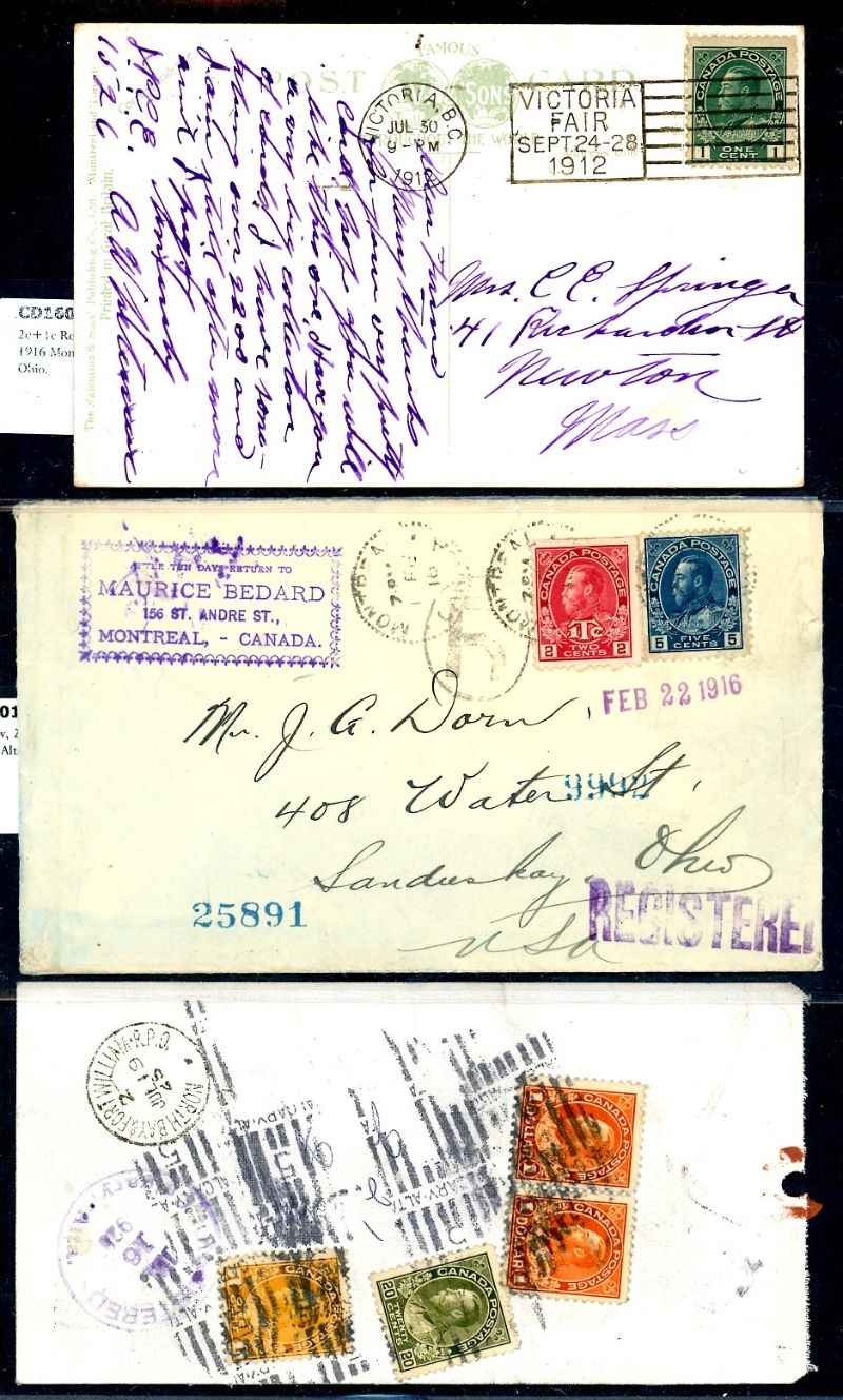 (32) covers in dealer annotated sleeves, showing various auxiliary markings or notations, 1884-2000, incl Advertised, Misdirected, Rec'd at Chicago in bad order, Train Late, Cannot be found, Received in wet condition, Box Closed, Found in Supposedly Empty Equipment, Delayed: Canadian Postal Strike, Free for the Blind and others; interesting group, gen F-VF (Image)